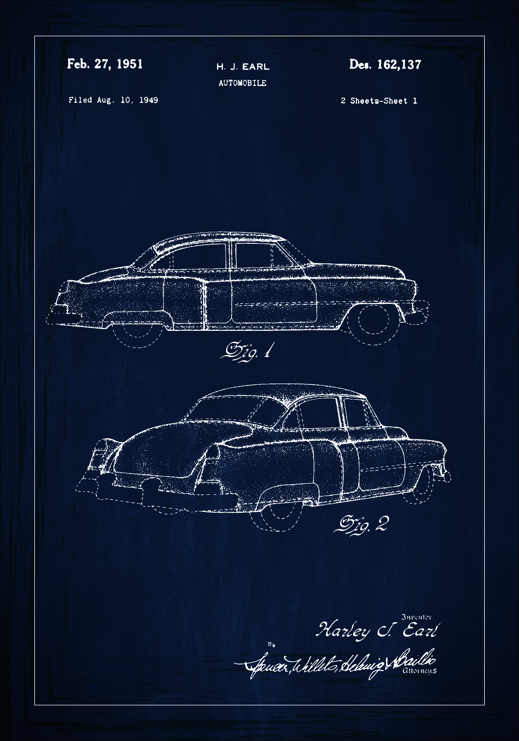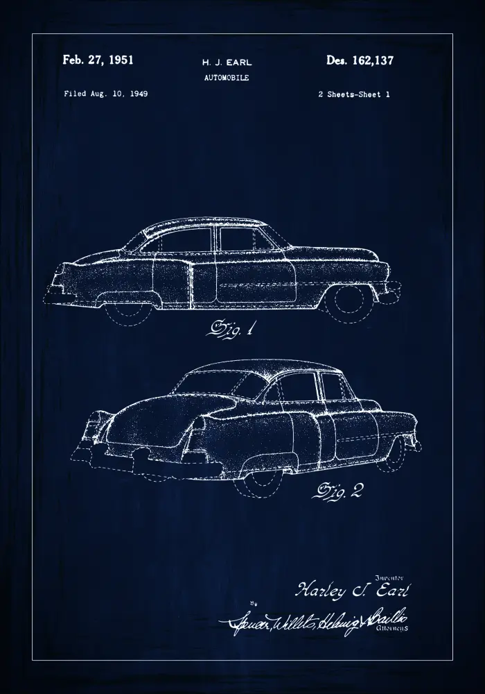 Tai yra patentinis plakatas, vaizduojantis klasikinio Cadillac dizainą, kuriam patentas buvo suteiktas 1951 m. vasario 27 d., numeriu Des. 162,137, H.J. Earl. Šis meno kūrinys užfiksuoja elegantišką ir aptakią automobilio siluetą dviem kampais, iliustruojančiais pramoninio dizaino darbą, kuris buvo iškilus pokario laikotarpiu. Tai yra dizainas, kuris paveikė automobilių pramonę ilgai po pirmojo jo pristatymo.