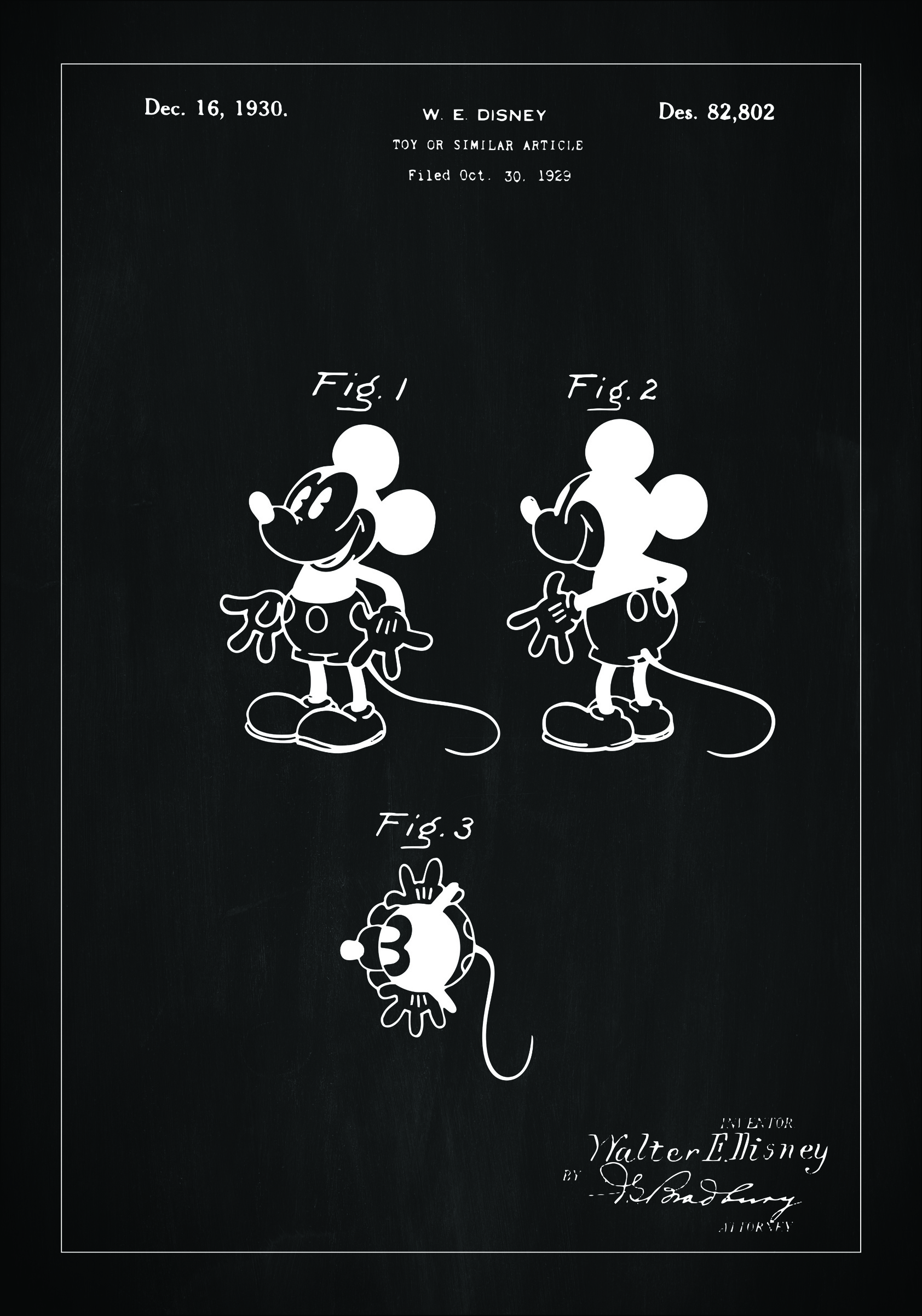 Šis unikalus patentų plakatas rodo klasikinį Mickey Mouse dizainą su didelėmis, apvaliomis ausimis ir būdingomis pirštinėmis, nustatytą pagal jo patento brėžinį, datuojamą 1930 m. gruodžio 16 d. Trys iliustracijos, pateiktos patentų plakate, demonstruoja skirtingas figūras: stovinčią, profilyje ir rankos detalių vaizdą. Kiekviena figūra yra sunumeruota, suteikiant aiškią dizaino skirtingų aspektų apžvalgą.