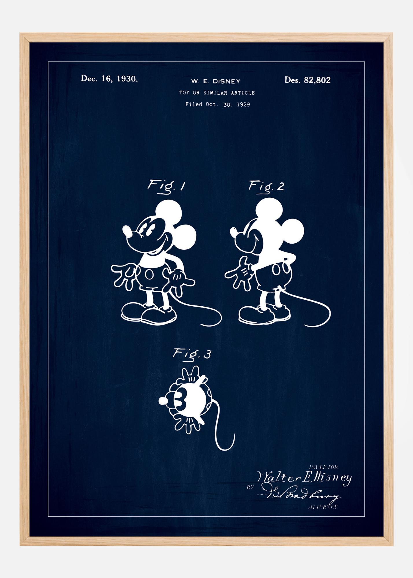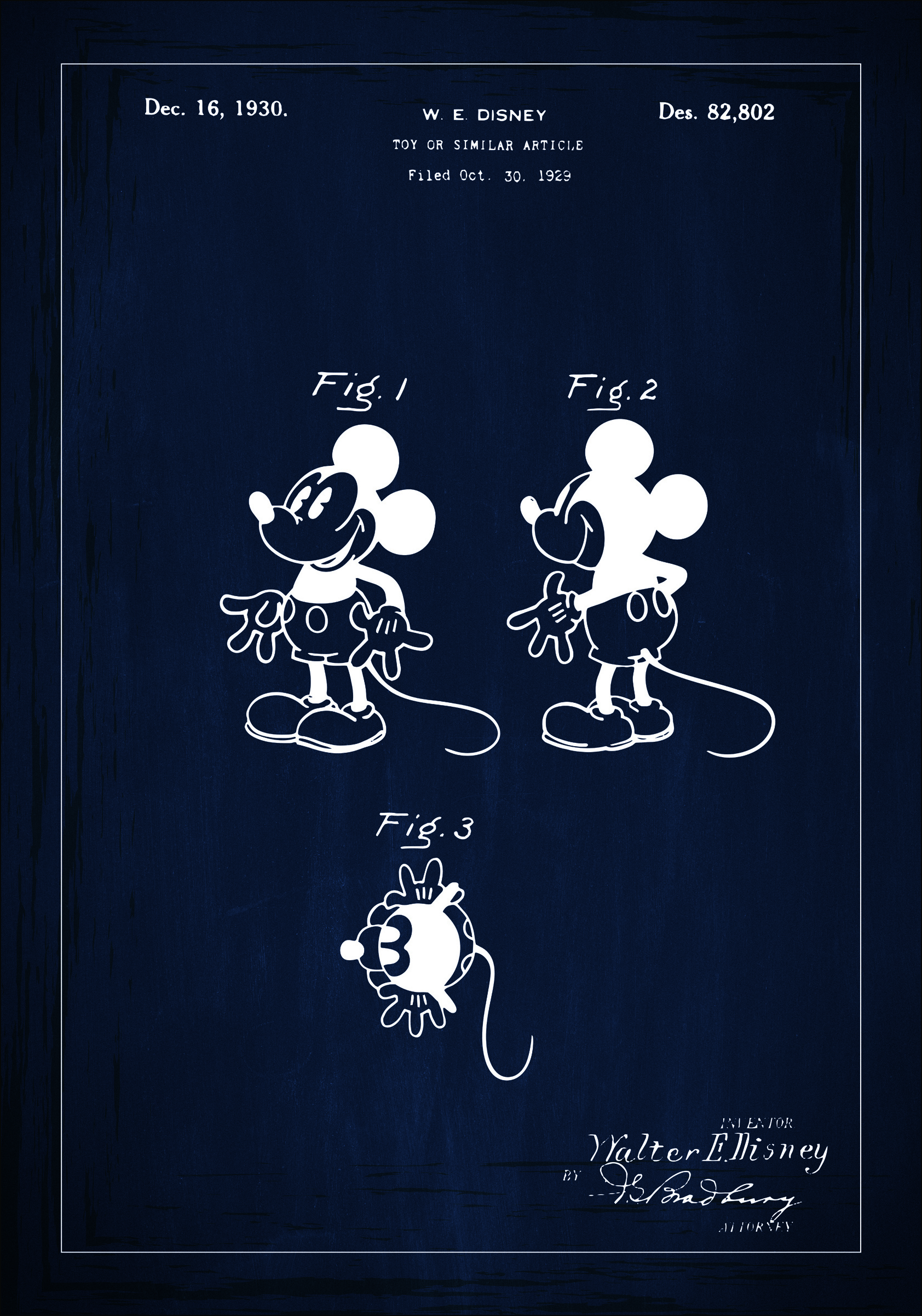 Ši patentinė afisa pabrėžia laiko nepaisančią dizaino klasiką, dokumentuotą patente Des. 82,802, išduotame 1930 m. gruodžio 16 d. W.E. Disney. Motyve įtraukti trys Mikio Pelės figūros, rodančios įvairius kampus ir dizaino detales: personažas iš priekio, profilis ir rankos detalė, visi numeruoti, siekiant iliustruoti specifines šios ikoniškos formos savybes.