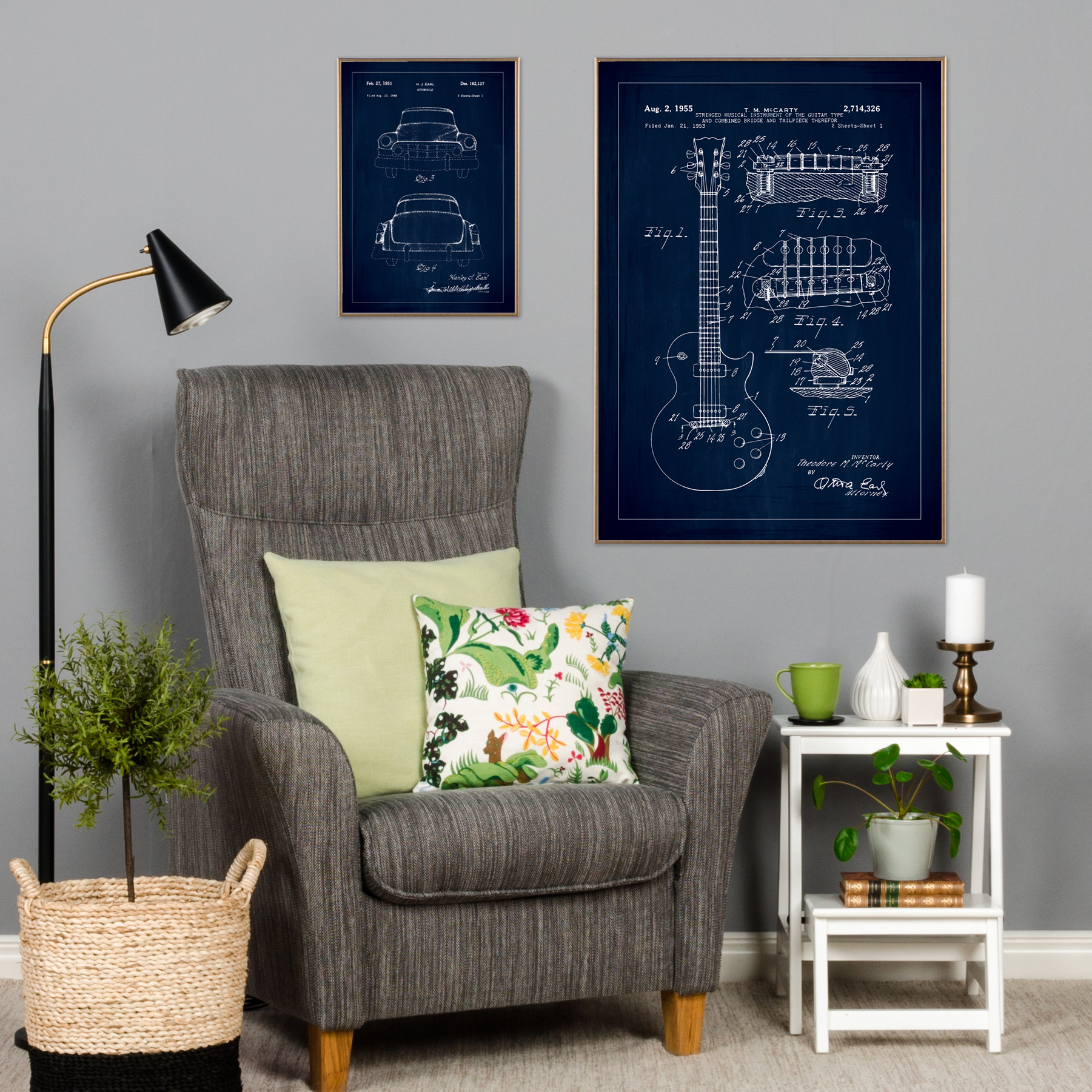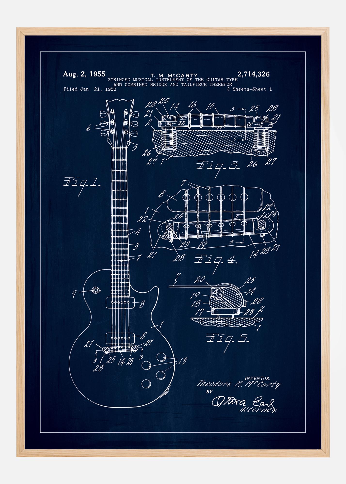Ši patentų plakatas rodo išsamią ir tikslią styginio muzikos instrumento brėžinį nuo 1955 m. rugpjūčio 2 d., su patentu nr. 2,714,326. Šio instrumento patentą, kuris daugeliui būtų atpažįstamas kaip elektrinė gitara, užregistravo Theodore M. McCarty 1953 m. sausio 21 d. Plakatas vaizduoja instrumentą elegantiškoje bendroje nuotraukoje bei technologiškai pažangiuose detalių vaizduose, pabrėžiant jo novatorišką dizainą ir sujungtą tiltelį bei balną kaip dalį unikalių savybių.