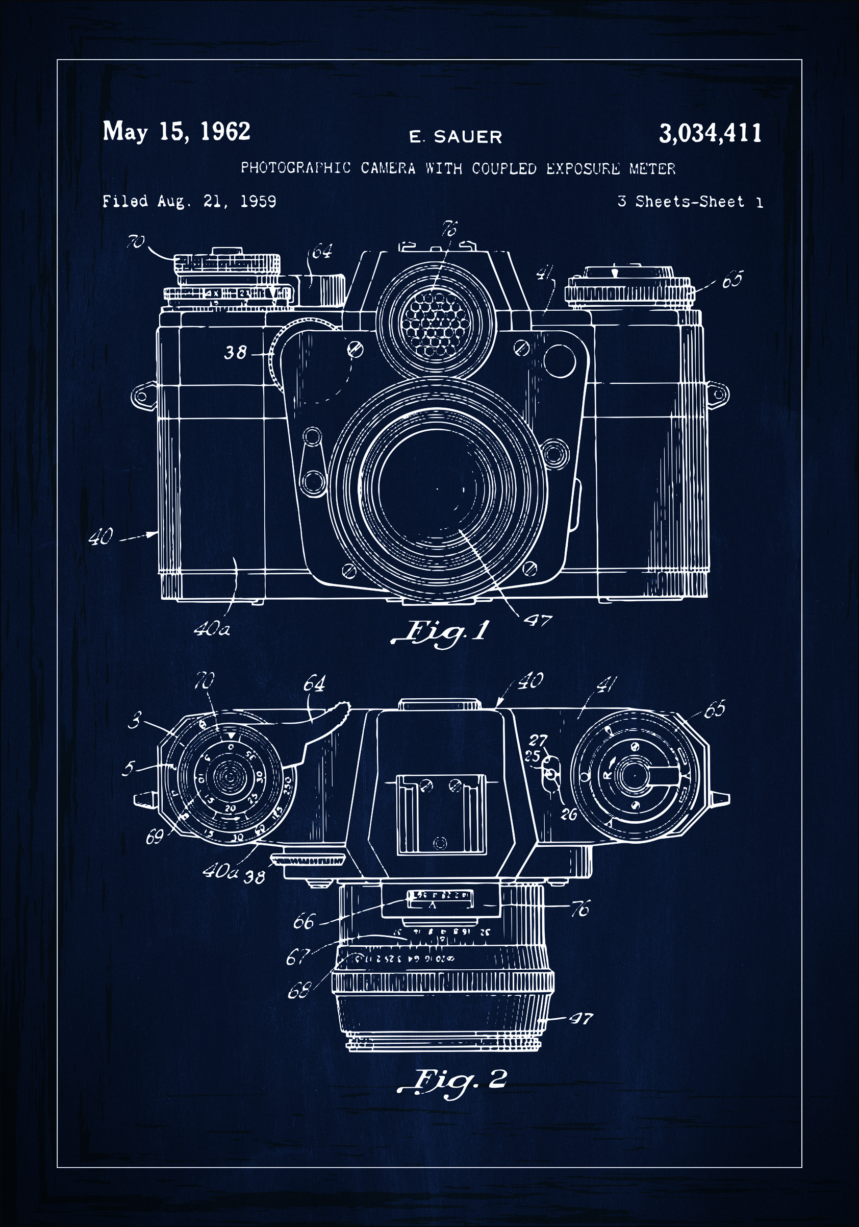 Šis stilingas patentinis plakatas vaizduoja detalų fotografijos kameros su prijungtu ekspozicijos matuokliu, patentas Nr. 3,034,411, datuotas 1962 m. gegužės 15 d., brėžinį. Patentą, kurį pateikė E. Sauer 1959 m. rugpjūčio 21 d., rodo detalus kameros sudėtingos mechanikos ir estetiškai patrauklaus dizaino vaizdavimas. Šio patentinio brėžinio techninėse iliustracijose pavaizduota kameros viršutinė ir priekinė vaizdai, taip pat jos apatinė dalis, suteikiant visapusišką jos konstrukcijos ir funkcionalumo vaizdą.