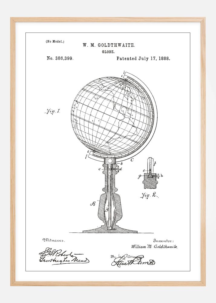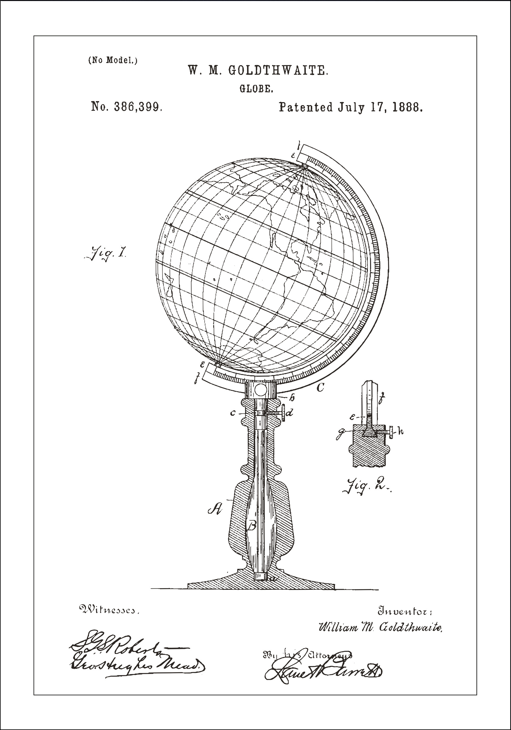 Šis patentinis plakatas pristato kruopščiai suprojektuotą W. M. Goldthwaite gaublį, kuris buvo įamžintas su patentu numeriu 386,399, išduotu 1888 m. liepos 17 d. Plakatas pabrėžia nesenstančią eleganciją ir pedagoginį šios klasikinės išradimo vertę, iliustruodamas žmonių siekį žemėlapiuotis ir suprasti mūsų pasaulį. Šios patentinės brėžinio detalės rodo tikslumą ir meistriškumą, sukurdamos pokalbio temos bet kuriame kambaryje.