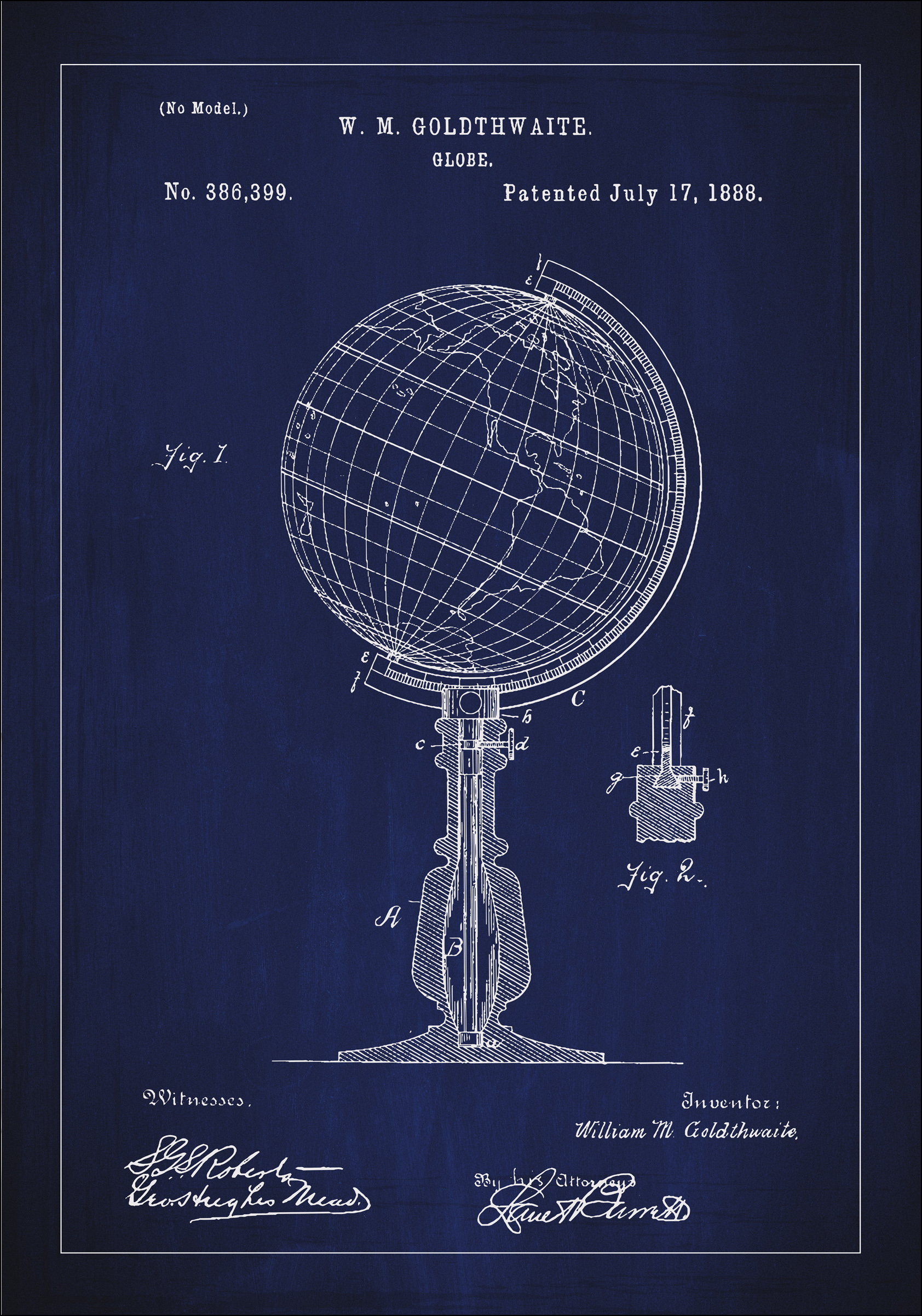 Sukurkite patrauklią ir intelektualiai stimuliuojančią erdvę su mūsų patentuotu plakatu, vaizduojančiu W. M. Goldthwaite klasikiškai sukurtą gaublį, apsaugotą patentu numeriu 386,399 nuo 1888 m. liepos 17 d. Šis detalus patentinis brėžinys ne tik atspindi dizaino techninį tikslumą, bet ir laiką, kai pasaulinis atradimas ir supratimas tapo prieinamas platesnei auditorijai. Tokia meninė pasaulio vaizdavimo forma siūlo edukacinę perspektyvą, tuo pačiu būdama elegantiška dekoracija.