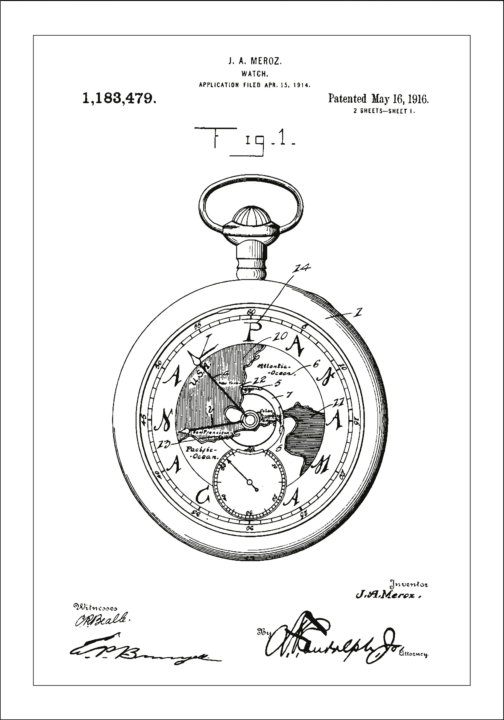 Tai įspūdingas patentinis plakatas, rodantis išsamią J.A. Meroz laikrodžio dizaino eskizą, patentuotą 1916 m. gegužės 16 d. numeriu 1,183,479. Patentinė brėžinys detaliai vaizduoja klasikinį kišeninio laikrodžio siluetą su išskirtiniais laiko matuoklio vidinės mechanikos elementais, pabrėždamas techninės inovacijos erą ir amatininkų įgūdžius laikrodžių gamyboje.