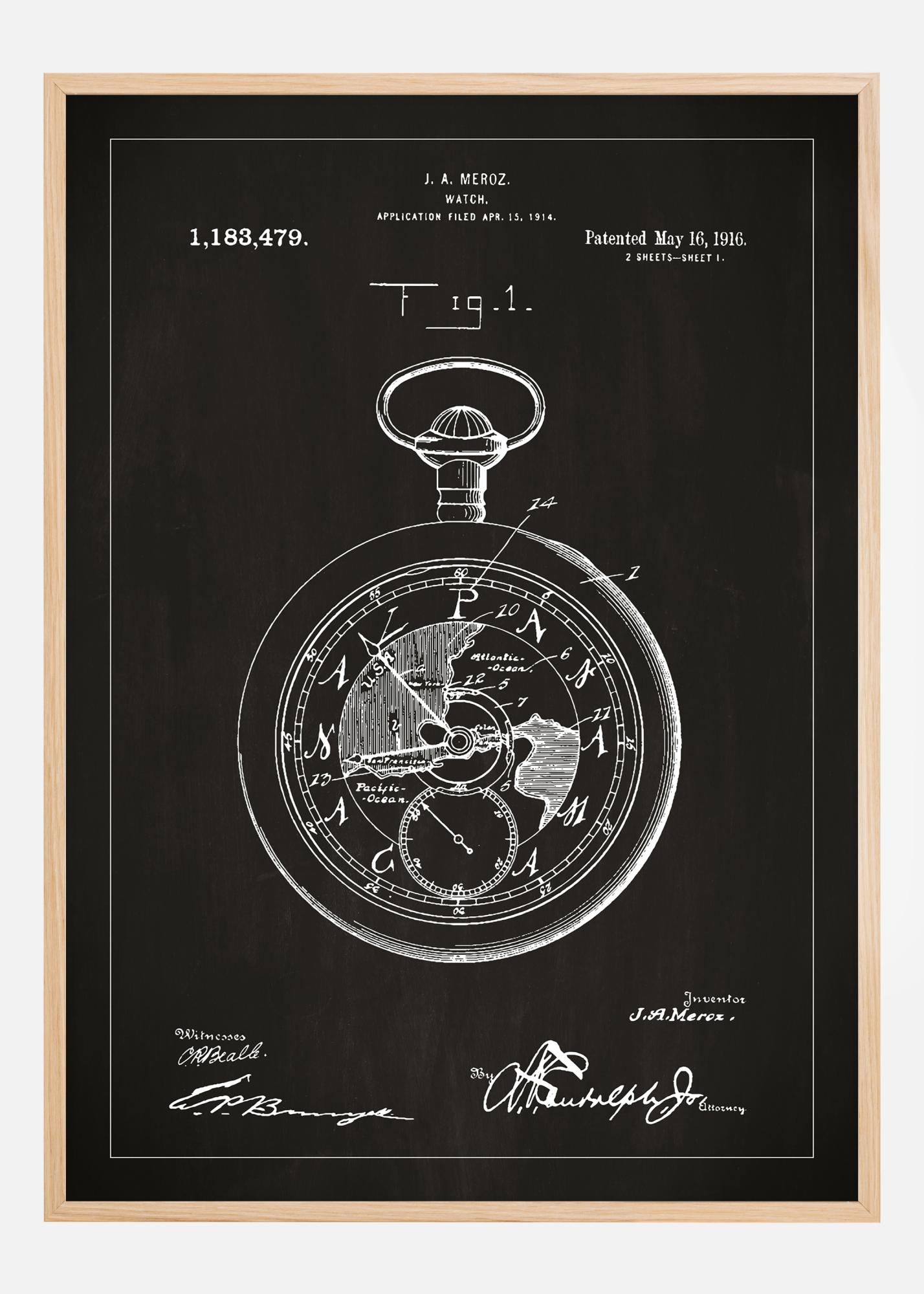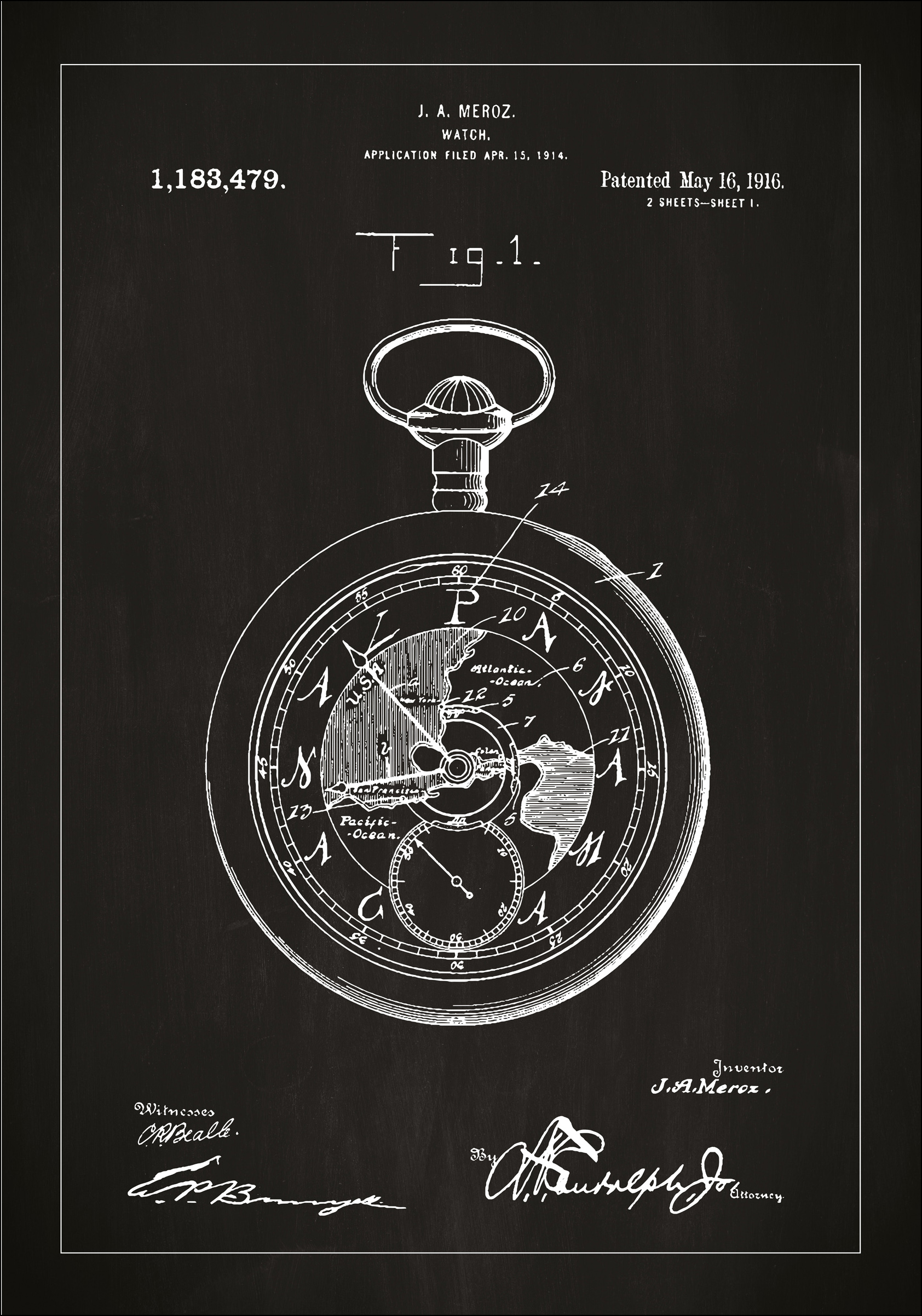 Ši rafinuota patentų afisa vaizduoja nesenstančią kišeninio laikrodžio išradimą, patentuotą J.A. Meroz 1916 m. gegužės 16 d., pagal patentą numeriu 1,183,479. Detalizuotas patentų brėžinys rodo sudėtingą laikrodžio mechanizmo dizainą, pilną mechaninių detalių, kurios atspindi erą, kai tikslumas laiko matavime tapo savotišku meno formu.