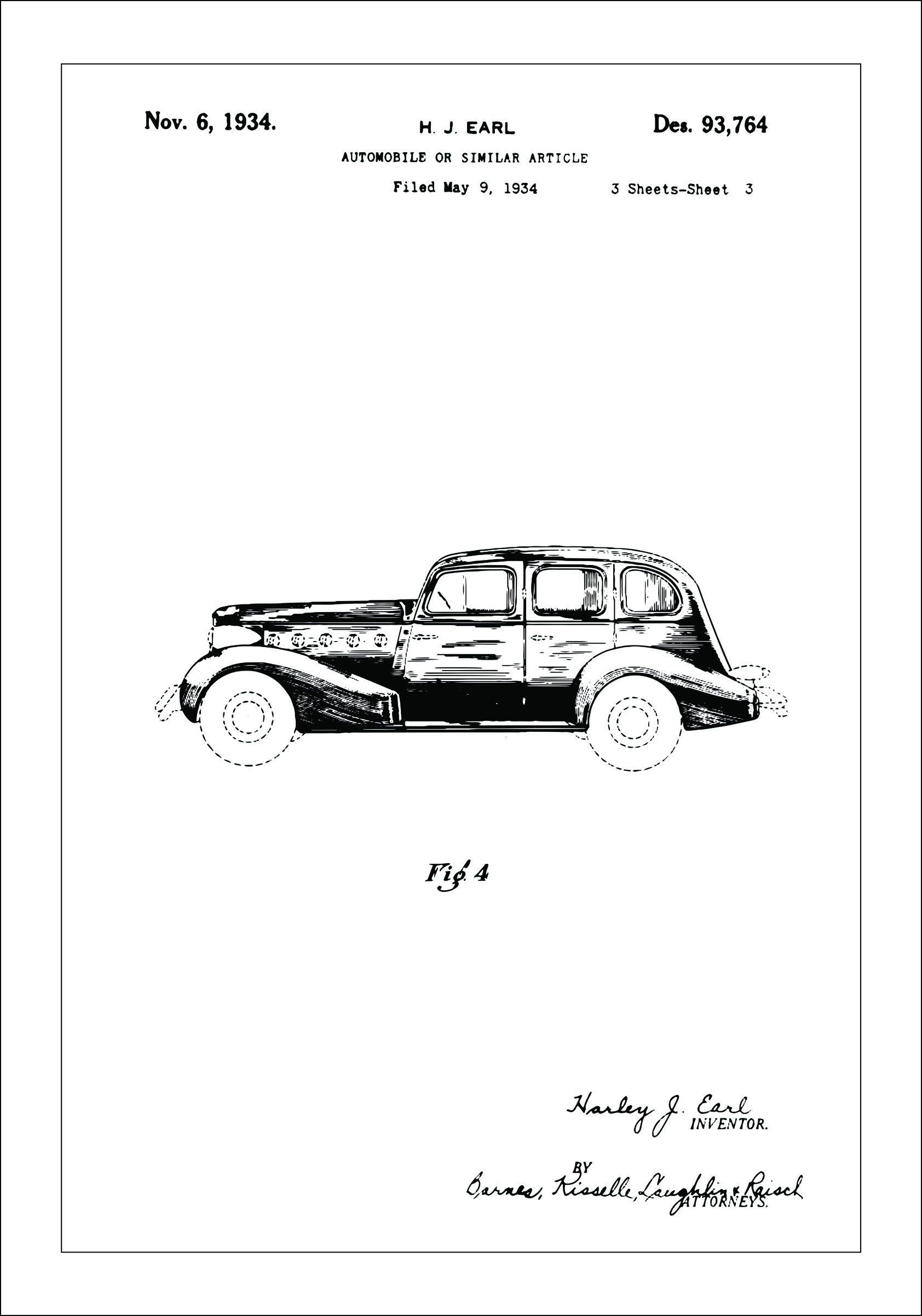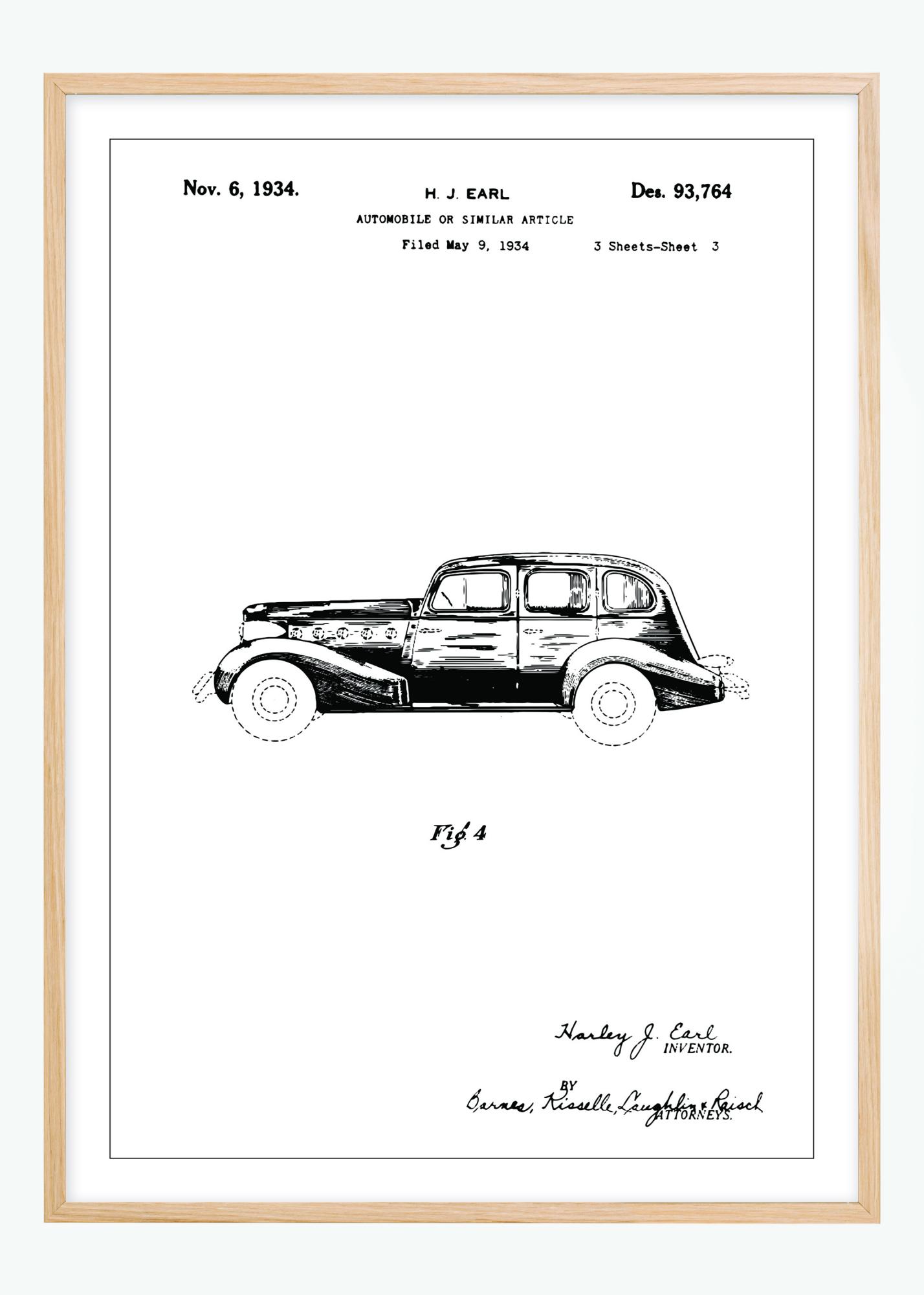 Šis patentinis plakatas vaizduoja automobilį, patentuotą H.J. Earl 1934 m. lapkričio 6 d. pagal patento numerį Des. 93,764. Išradimas susijęs su automobiliu ar panašiu gaminiu, nurodytu paraiškoje, pateiktoje 1934 m. gegužės 9 d. Brėžinys pateikia šoninį transporto priemonės vaizdą, kuris aiškiai parodo jos dizainą ir proporcijas, būdingas tam laikotarpiui.
