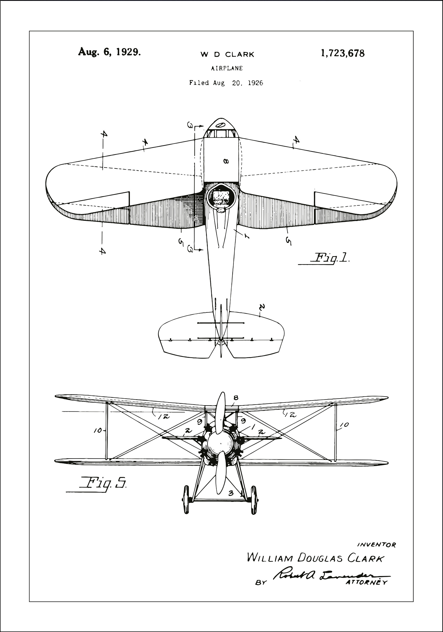 Turinti klasikinį paprastumą, ši patente plakatas užfiksuoja W D Clark'o lėktuvo dizainą, dizainą, kuris įkūnija ankstyvosios aviacijos dvasią. Patentas buvo suteiktas 1929 m. rugpjūčio 6 d., numeriu 1,723,678, ir ši iliustracija yra inovacijų laiko kapsulė. Plakato švarios linijos ir aštrios detalės pagerbia techninę pažangą, kuri buvo lemiama aviacijos ateičiai.