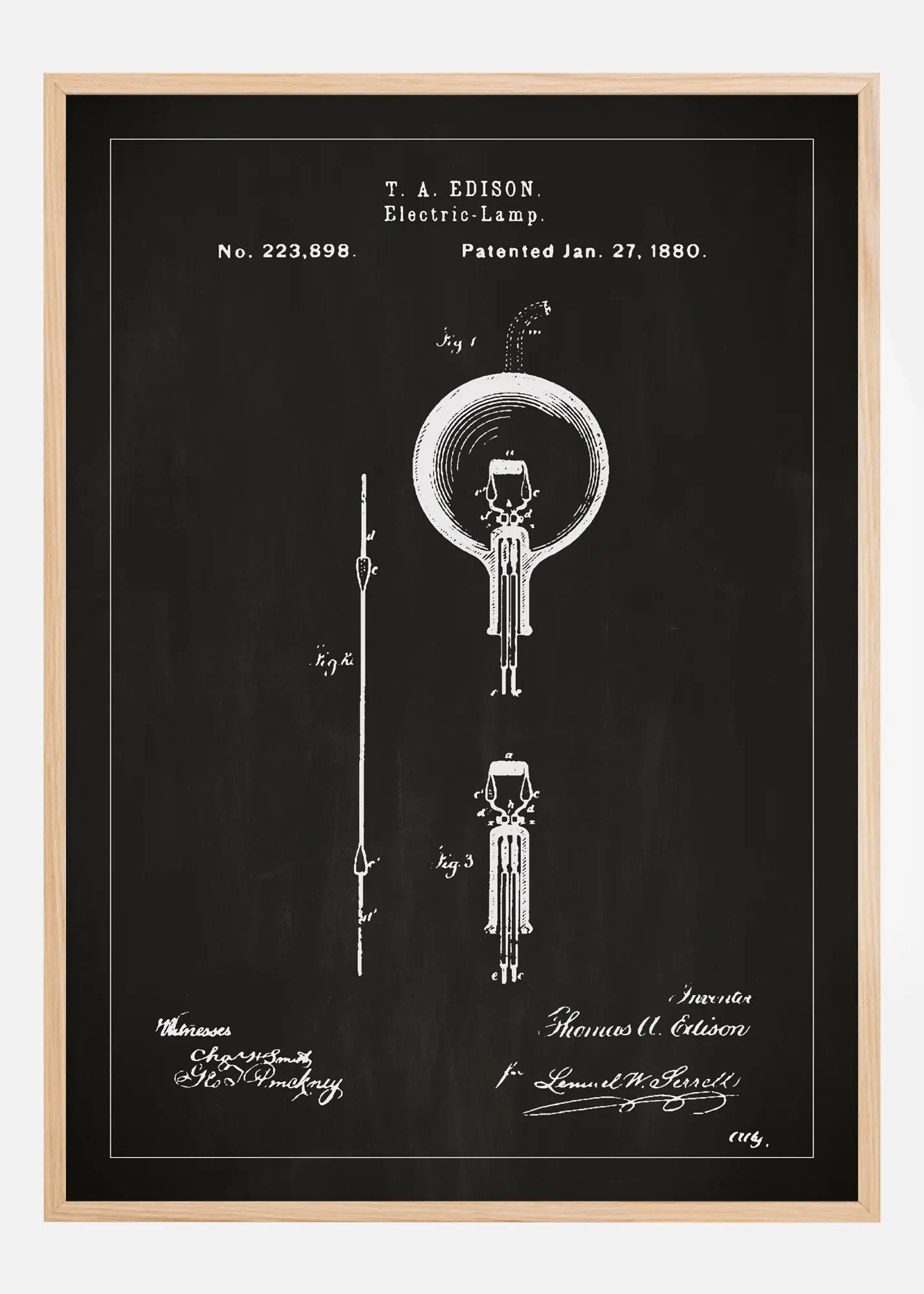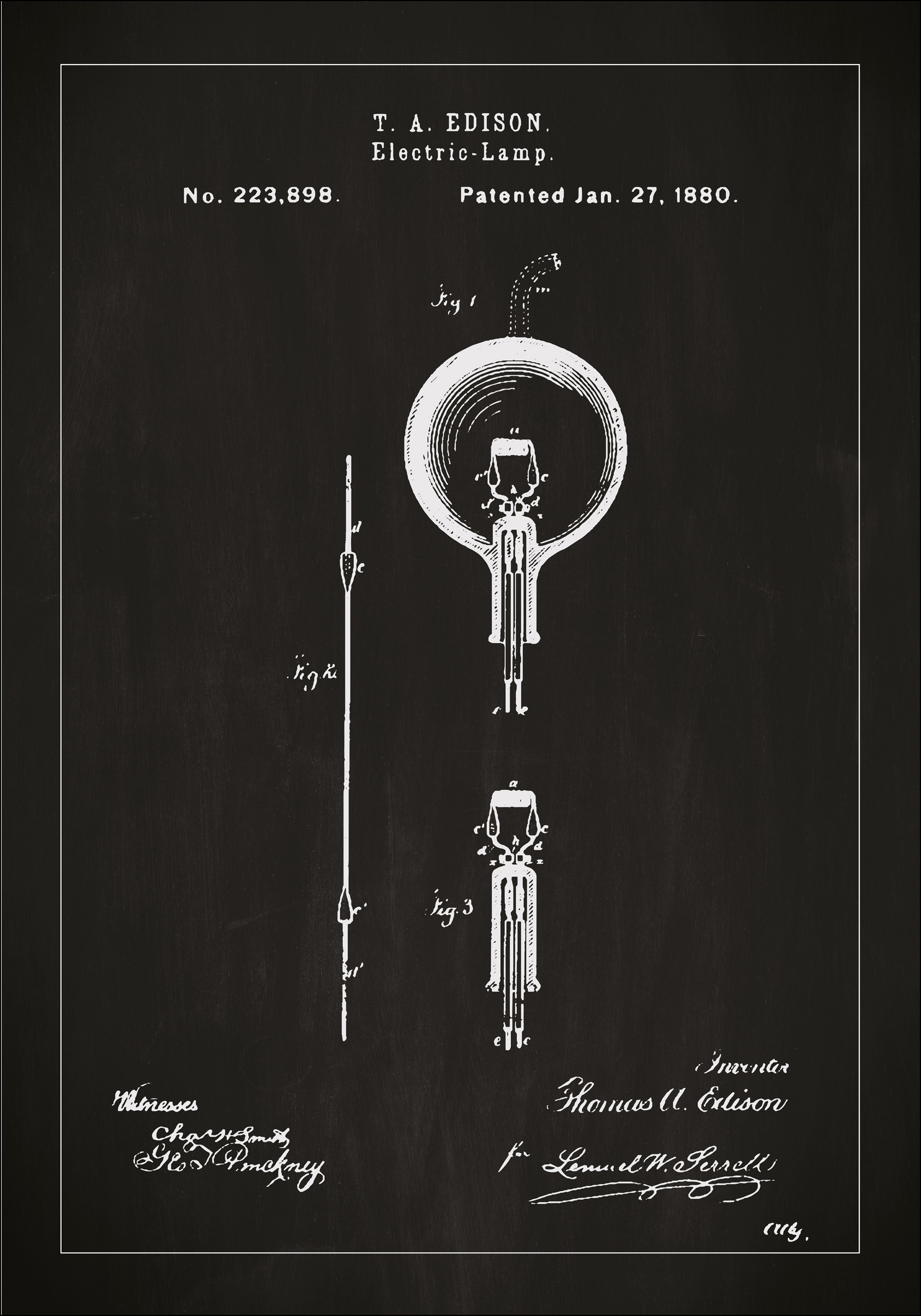 Šis išskirtinis patentinis plakatas pabrėžia Thomas A. Edisono revoliucinį elektrinės lempos dizainą, ikonišką proveržį technologijų istorijoje. Su patento numeriu 223,898, išduotu 1880 m. sausio 27 d., ši patentinė brėžinys reprezentuoja revoliucinį išradimą, pakeitusį žmonijos būdą patirti šviesą. Iliustracija pati savaime yra meno kūrinys, atvaizduojantis Edisono originalią konstrukciją tiek elegancija, tiek detalių gausa, todėl ji yra ideali interjero detalė bet kuriai erdvei ir ypač tiems, kurie vertina mokslinę inovaciją ir dizainą.