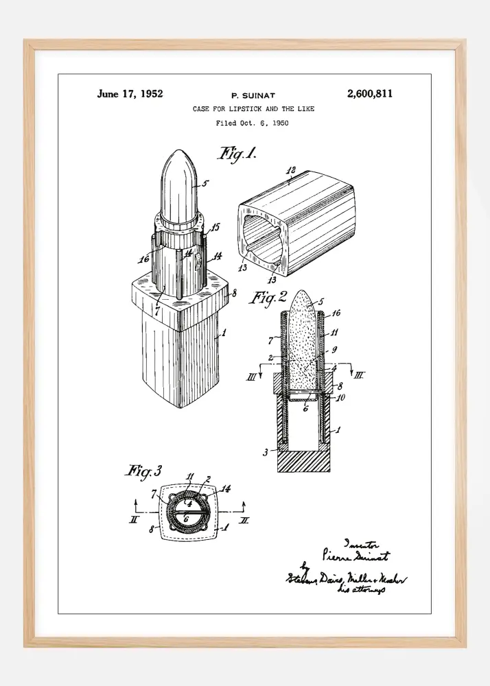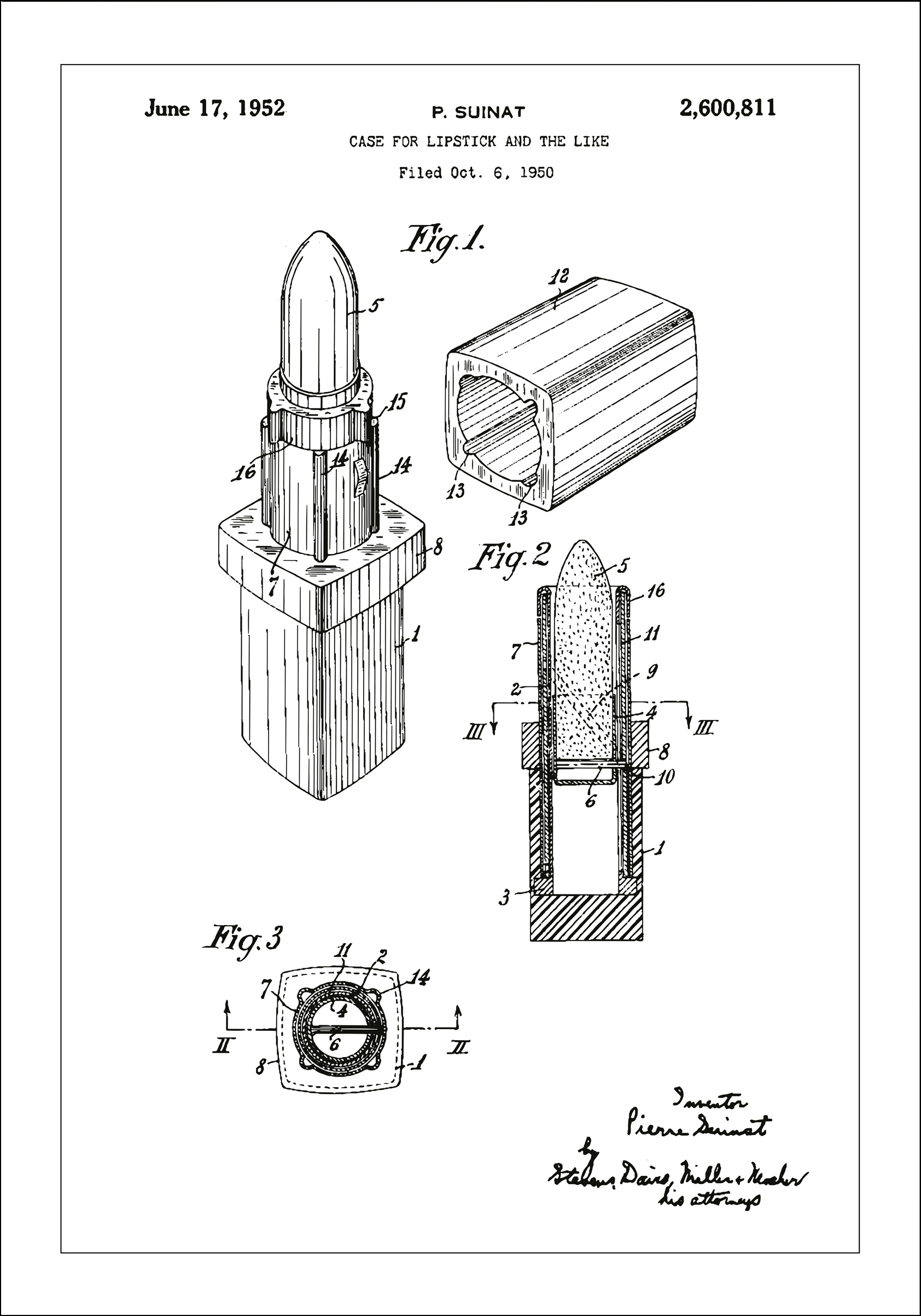 Ši stilinga patentų afiša vaizduoja inovatyvų lūpdažių dėklo dizainą, kuris buvo suteiktas P. Suinat pagal patento numerį 2,600,811 1952 m. birželio 17 d., pateikus paraišką 1950 m. spalio 6 d. Detali iliustracija rodo klasikinio grožio aksesuarų dizainą, suteikdama įžvalgą kosmetikos pramonės techninėje ir estetinėje raidoje. Afišos švarios linijos ir tikslus atvaizdavimas daro ją idealia interjero detale grožio salonams, makiažo studijoms arba kaip unikalų sienų meno kūrinį visiems, kurie vertina senoviniai grožio aksesuarai ir dizainą.