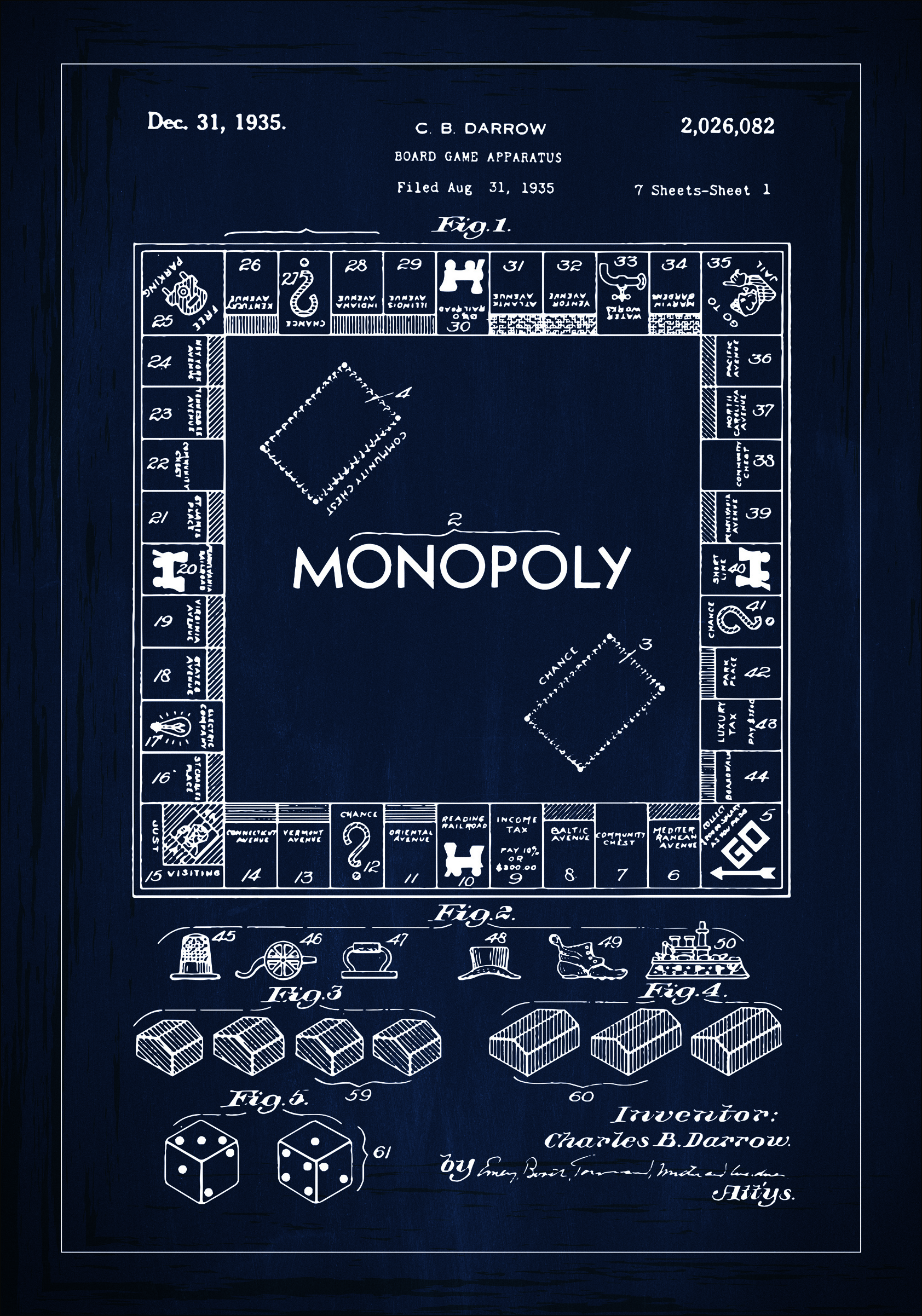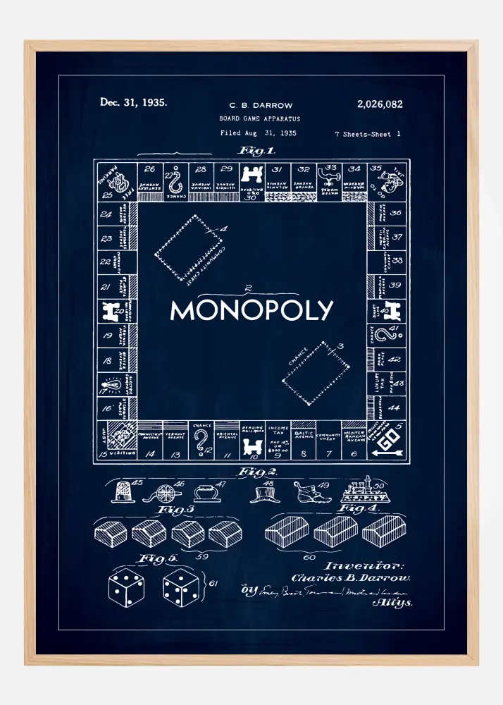 Išskirkite savo interjerą su šiuo klasikiniu patento plakatu, kuriame pateiktas patentas numeris 2,026,082 mėgstamam stalo žaidimui Monopolis, kurį sukūrė C. B. Darrow ir kuris buvo patentuotas 1935 m. gruodžio 31 d. Detalizuotas iliustravimas apima visus žaidimo aspektus, nuo žaidimų lentos su jos nuosavybėmis ir geležinkeliais iki išskirtinių žaidimų figūrėlių ir kauliukų, viskas ant elegantiško tamsiai mėlyno fono.