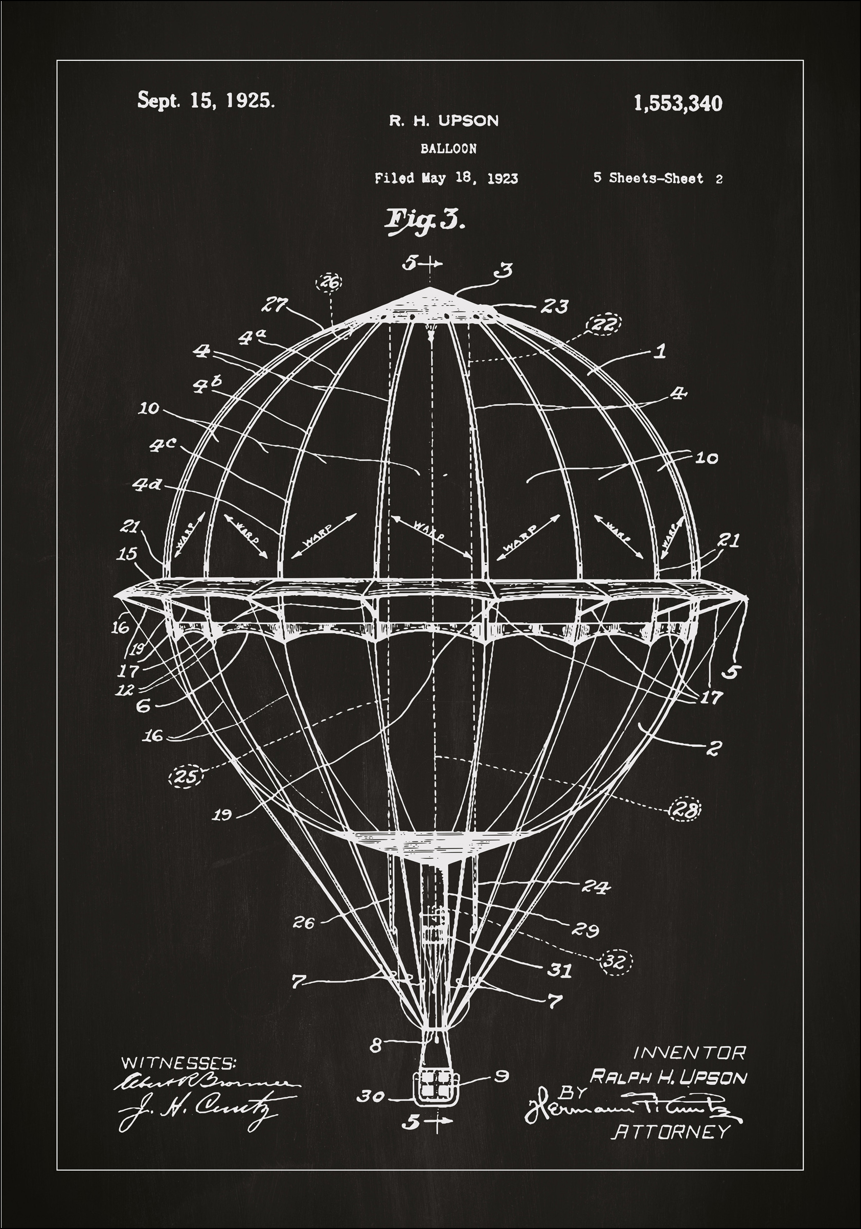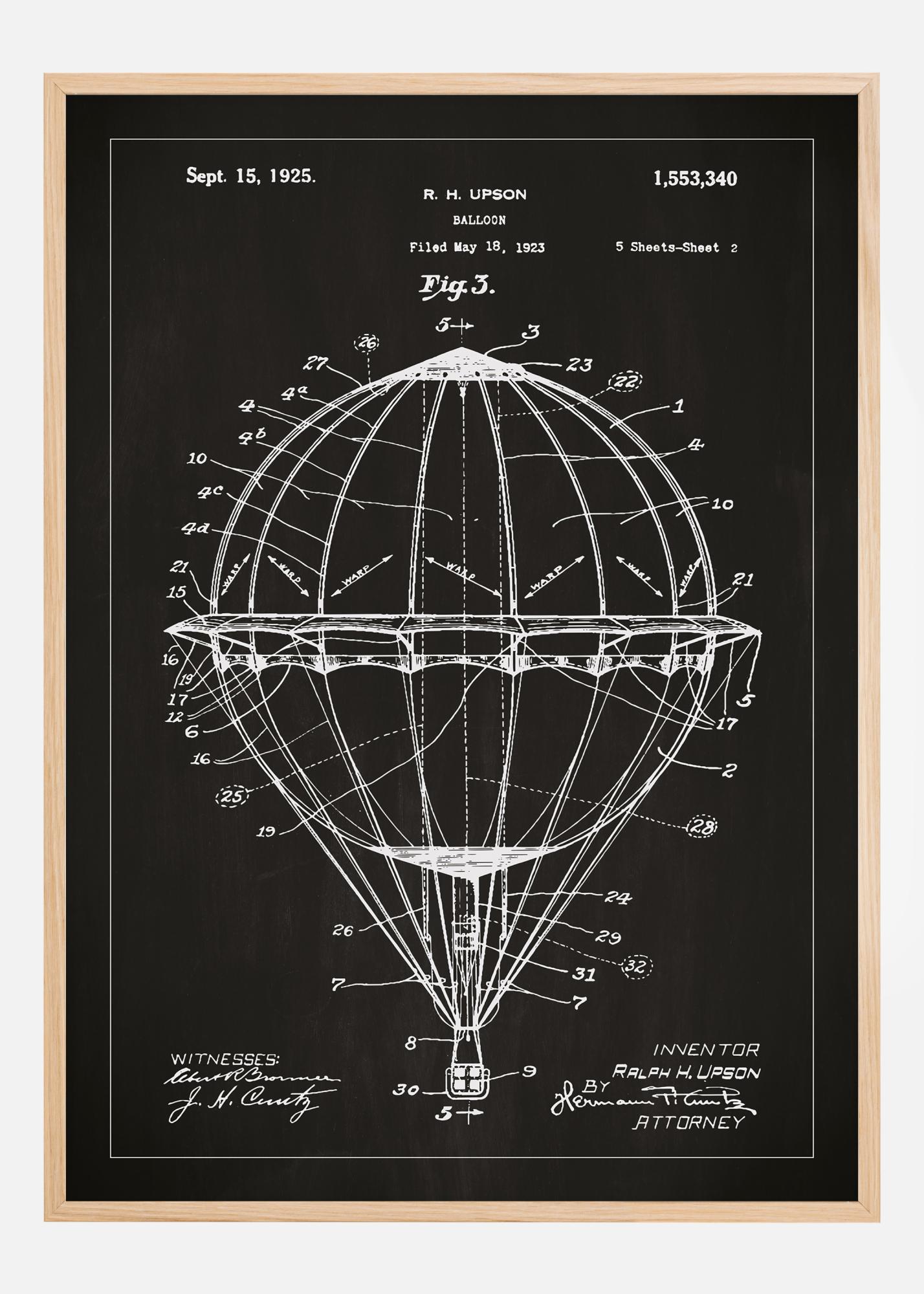 Šis unikaliai sukurtas patentinis plakatas iliustruoja išsamų oro baliono konstrukcijos brėžinį, kurio originalų patentą sukūrė novatorius Ralph H. Upson. Patentą gavo 1925 metų rugsėjo 15 dieną, su numeriu 1,553,340, tai yra įspūdingas ankstyvos aerodinaminės inžinerijos pavyzdys. Šis patentinis plakatas yra duoklė svajonei sklandyti tarp debesų ir žmonijos siekiui tyrinėti dangų.
