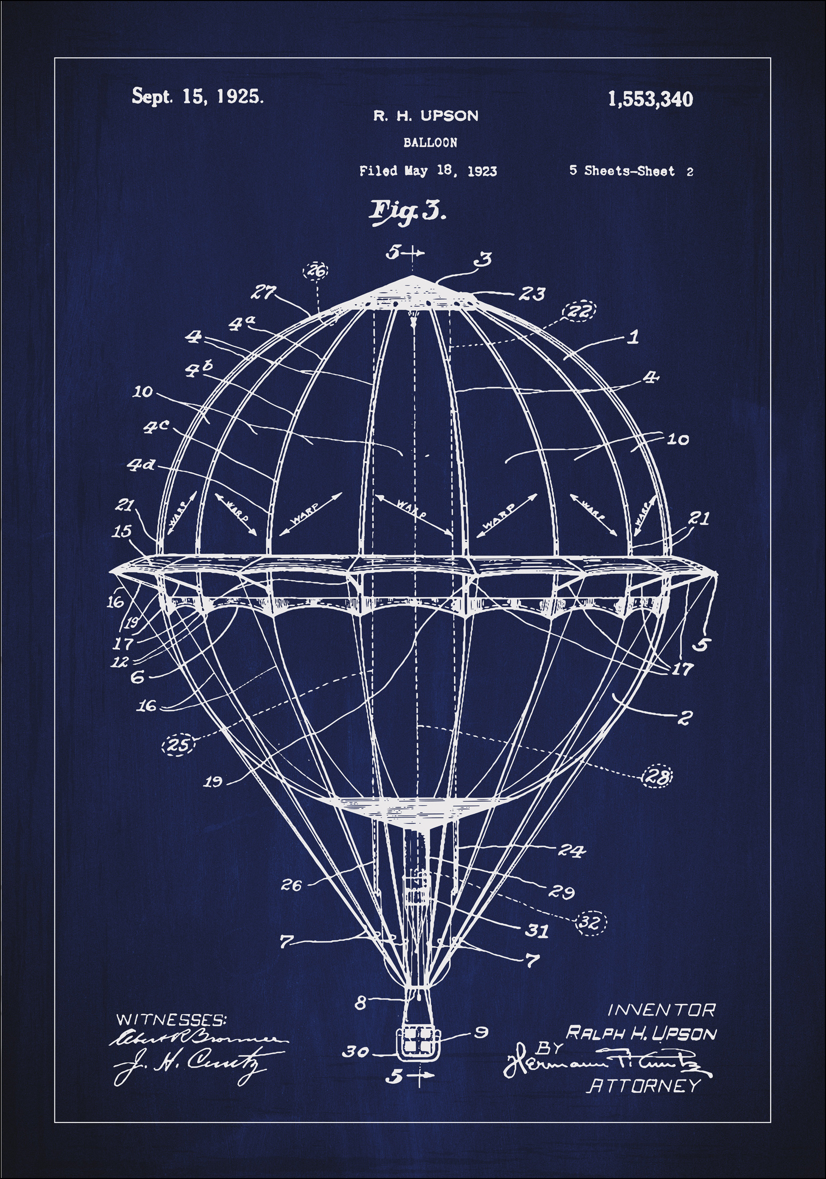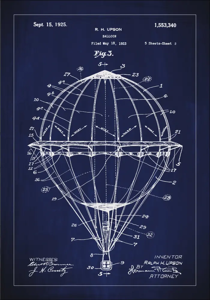 Autentiškam ankstyvųjų aviacijos technologijų pažangos entuziastui ši patento afiša suteikia įžvalgą į šlovingą aviacijos pionierių epochą. Pristatyta 1925 m. rugsėjo 15 d., ši patentinė brėžinys, numeris 1,553,340, iliustruoja Ralph H. Upson suprojektuotą oro balioną, kuris žymi svarbų aerodinaminio dizaino ir konstrukcijos etapą. Ši afiša yra neįkainojama žmogaus siekių ir svajonių apie dangiškus nuotykius reprezentacija.