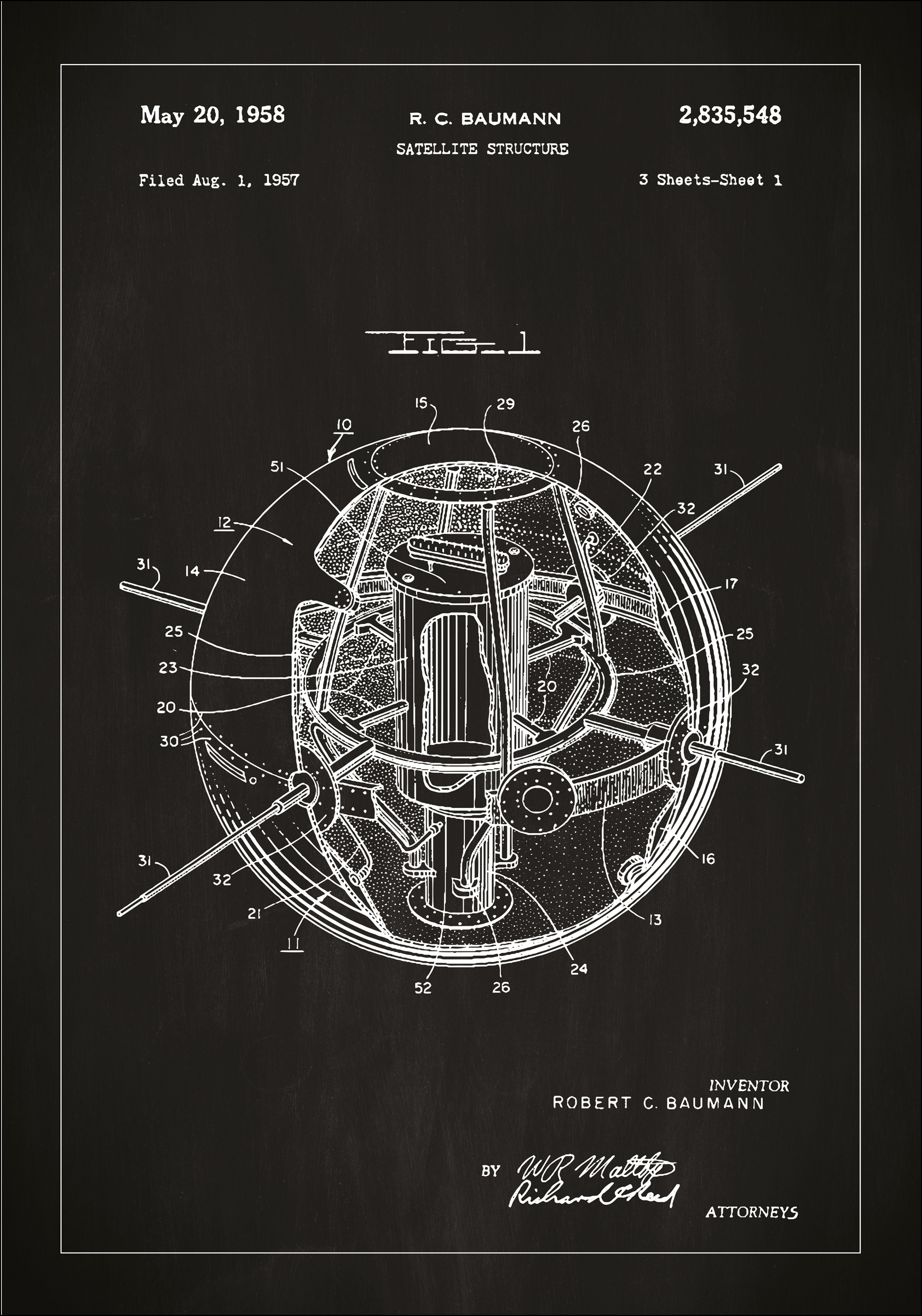 Ši ryški patentinė afisa vaizduoja novatorišką konstrukciją kosmoso technologijų aušroje: R.C. Baumanno „Palydovo struktūra“, patentuota 1958 m. gegužės 20 d., su patentu numeriu 2,835,548. Pateikta 1957 m. rugpjūčio 1 d., ši išsami patentinė brėžinys rodo ankstyvą dirbtinio palydovo modelį, su visomis jo dalimis ir unikaliomis geometrinėmis konfigūracijomis, atskleidžiančią novatorišką erą kosmoso lenktynėse.