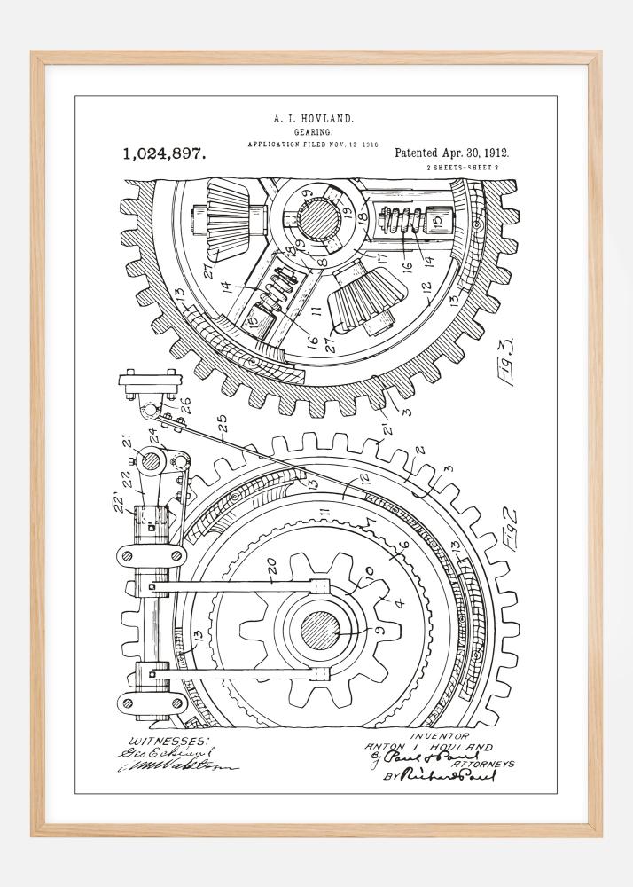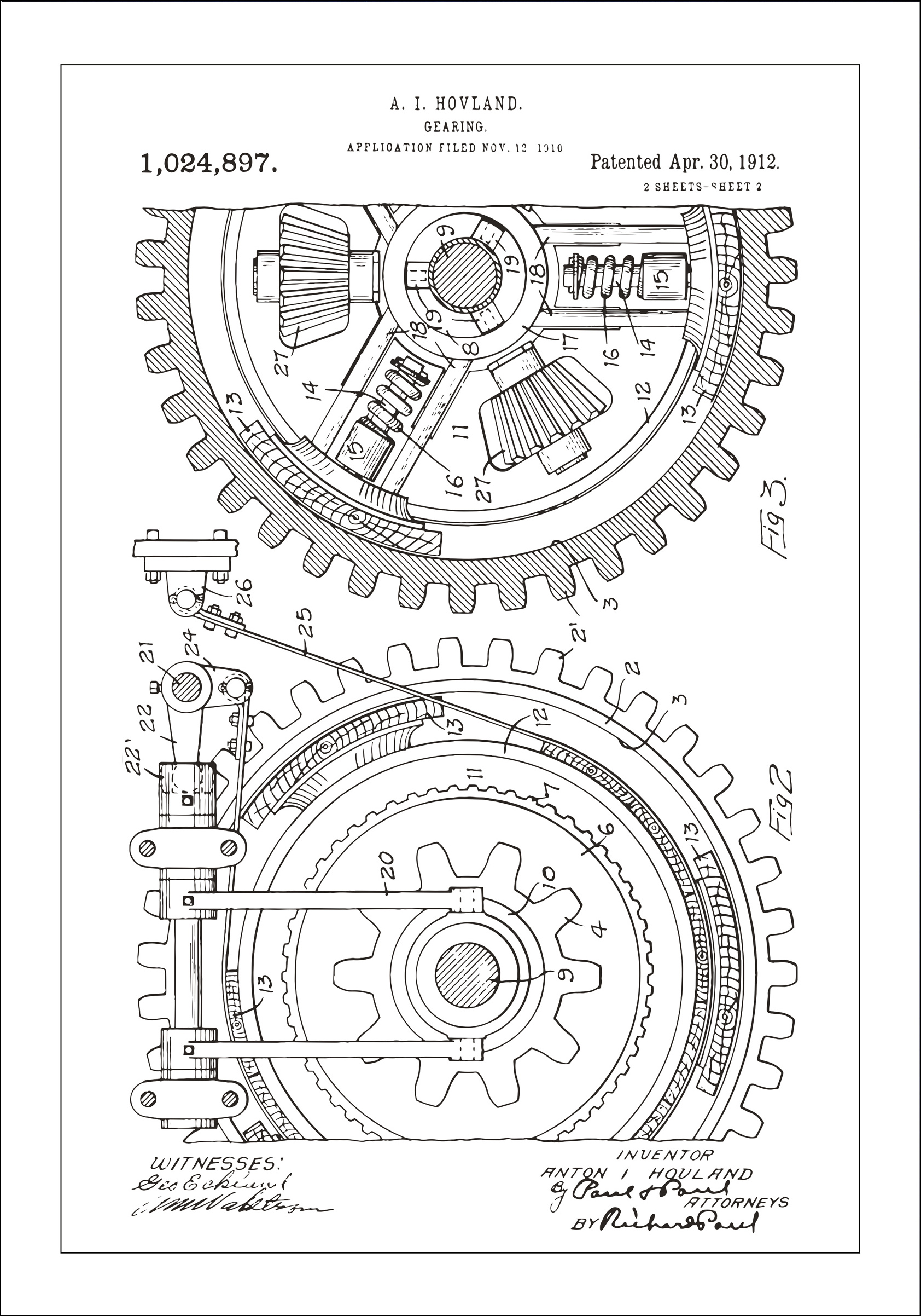 Papuoškite savo sieną šiuo klasikiniu patentu plakatu, kuris pristato A. I. Hovlando įmantrią pavarų dėžės konstrukciją, patentą numeriu 1,024,897, suteiktą 1912 m. balandžio 30 d. Šis detalus brėžinys pabrėžia ankstyvųjų mechaninių konstrukcijų techninį meistriškumą ir sudėtingumą. Dailios linijos ir kruopščios detalės šiame patento brėžinyje suteikia gilesnį inžinerijos istorijos supratimą ir yra iškilmingas papildymas bet kokiam techniniam ar pramoniniam interjero stiliui.