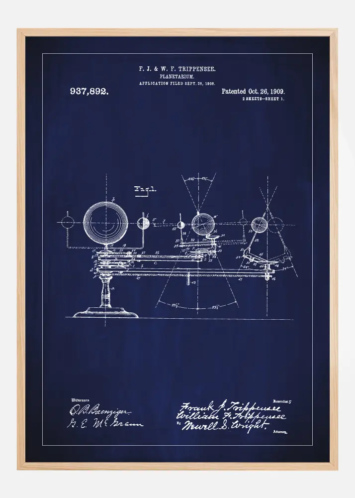 Šis iškilmingas patento plakatas vaizduoja planetariumo patento brėžinį, suteiktą F. J. & W. F. Trippensee pagal patento numerį 937,892. Patentas, oficialiai įregistruotas 1909 m. spalio 26 d., yra techninio piešimo ir dizaino šedevras, kuris įkūnija to meto mokslinius siekius ir išradingumą. Motyvai suteikia įžvalgą apie ankstyvąją astronomijos instrumentų istoriją ir yra išskirtinė dekoracija visiems, kurie domisi mokslo istorija arba vertina senovinius mokslinius instrumentus.