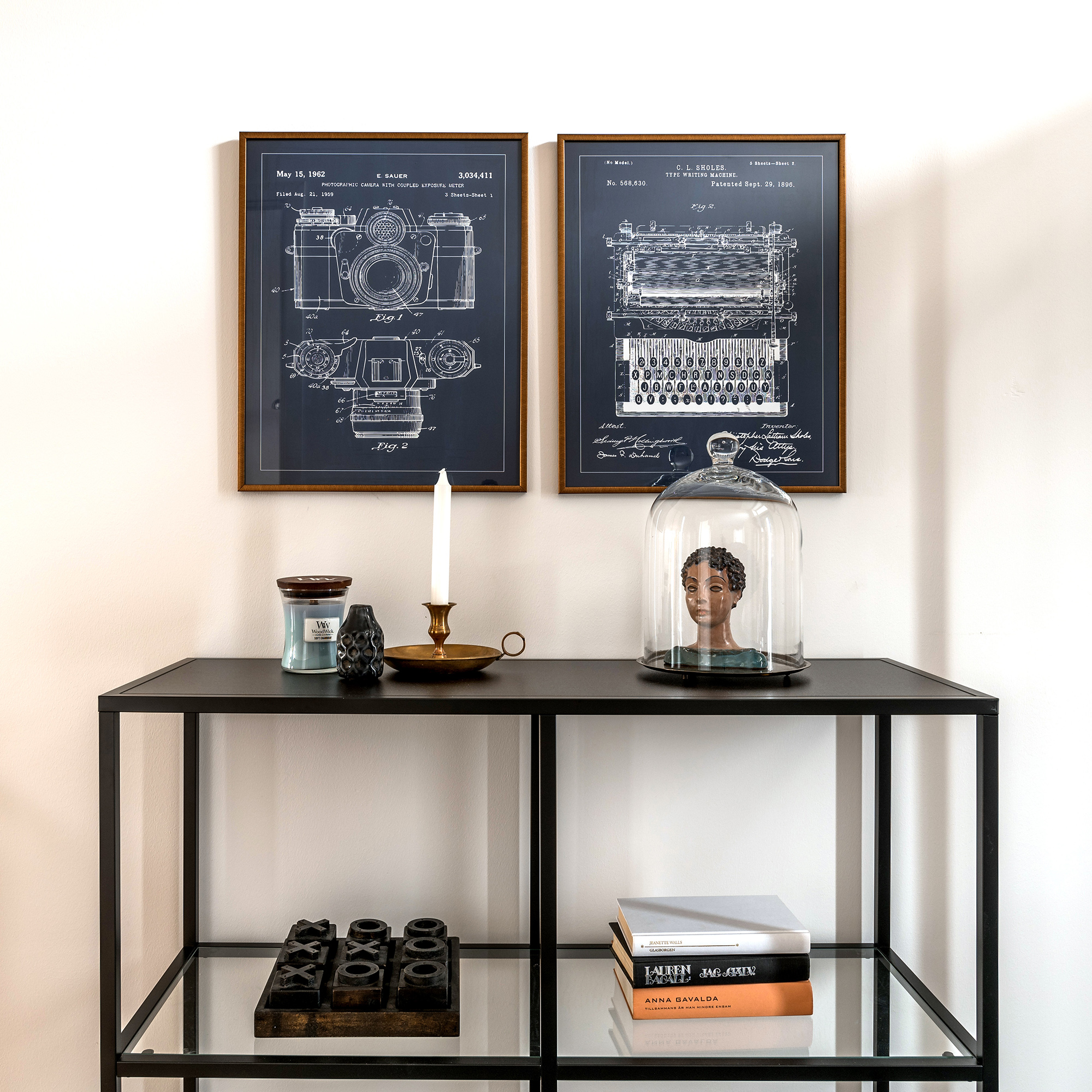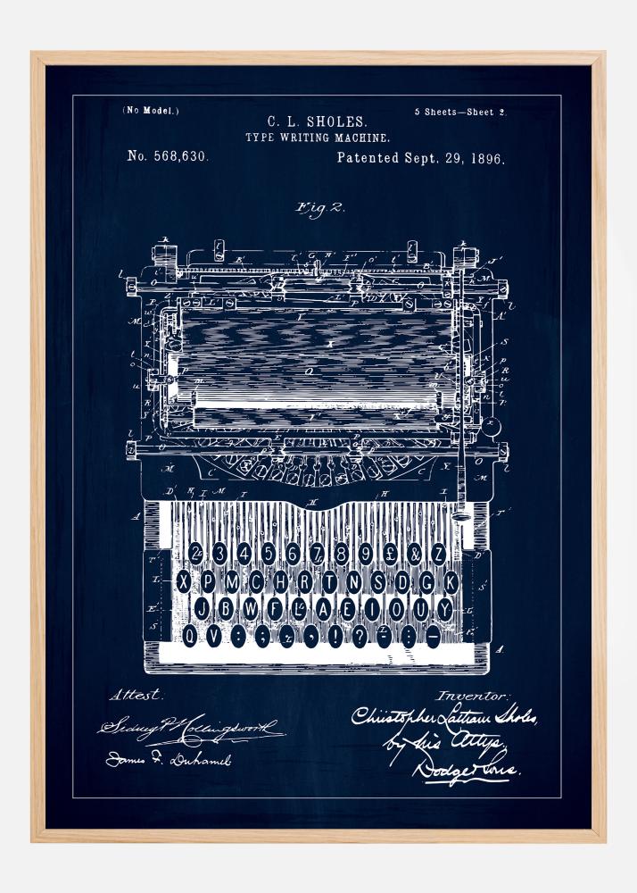 Pasigrožėkite šiuo išskirtiniu patentų plakatu, kuris vaizduoja istorinį rašomosios mašinėlės išradimą, patentas numeris 568630, suteiktas C. L. Sholes 1896 m. rugsėjo 29 d. Šis patentinis brėžinys yra ne tik ankstyvo rašymo įrenginio vizualinė reprezentacija, bet ir komunikacijos istorijos dalis, pateikta čia spindinčia balta linija ant tamsiai mėlyno fono, sukuriant stiprų ir patrauklų kontrastą.