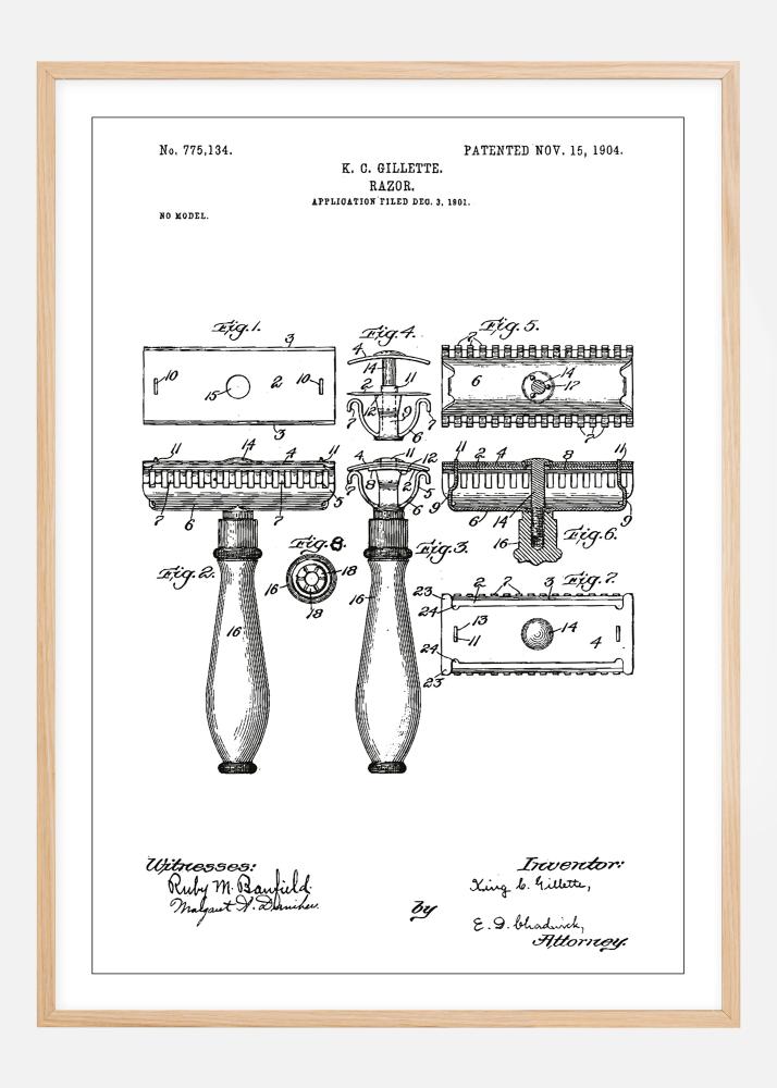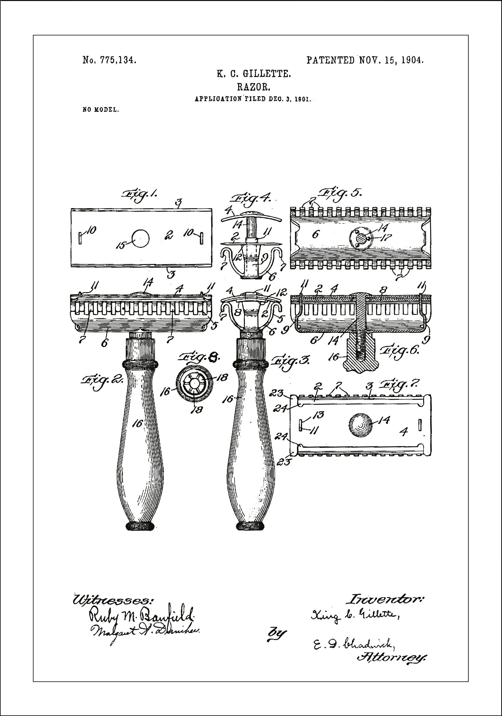 Šis patentų plakatas, kurio ikoninio ir elegantiško dizaino dėka pristatoma K.G. Gillette revoliucinė kūryba: skustuvas, patentuotas 1904 m. lapkričio 15 d., patentas nr. 775,134. Šio patentinio brėžinio detalės pabrėžia mechaninius aspektus ir novatorišką konstrukciją, kuri amžiams pakeitė asmeninę higieną, ir tai pirmą kartą buvo dokumentuota 1901 m. gruodžio mėn.