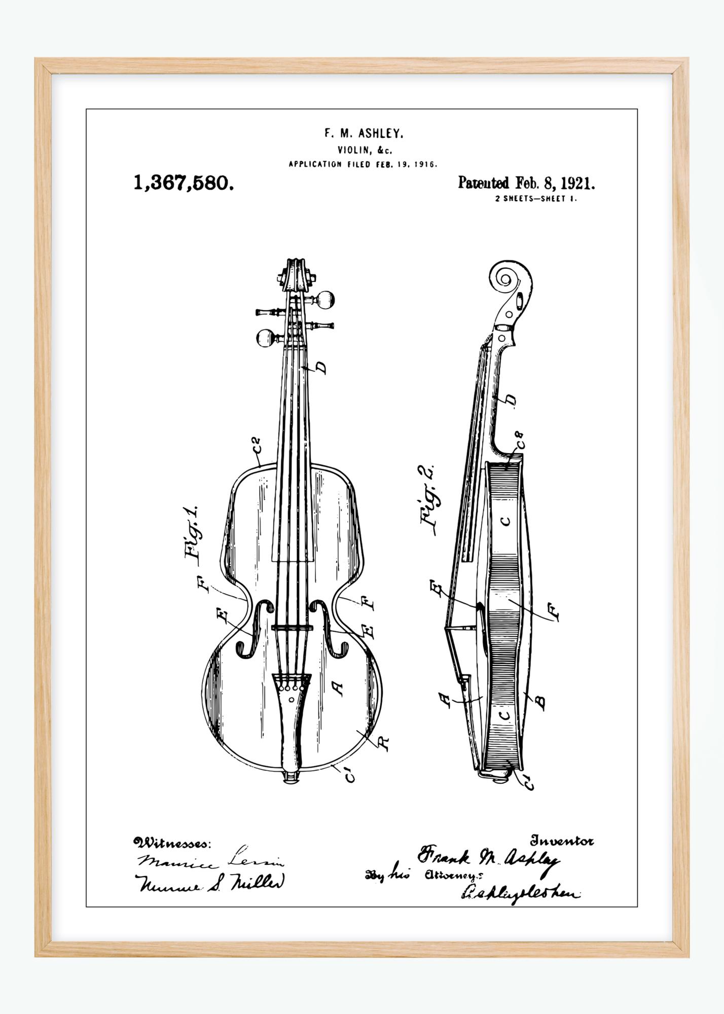 Šis elegantiškai suprojektuotas patentinis plakatas pristato klasikinį išradimą - smuiką - iš Amerikos patento 1,367,580. Patentą 1921 m. vasario 8 d. išdavė išradėjui F. M. Ashley, kurio parašas suteikia šiam istoriniam dokumentui asmeniškumo. Su savo tradicine ir nesenstančia išvaizda ši patentinė brėžinys yra pagarbos ženklas muzikos ir amato pasauliui.