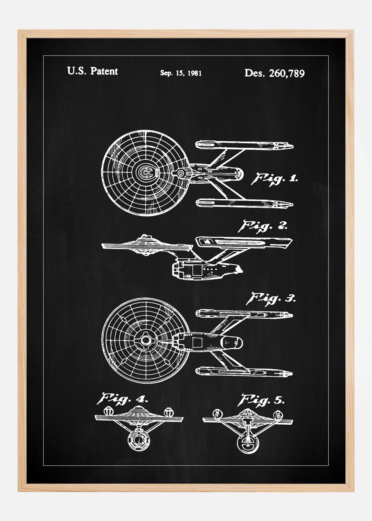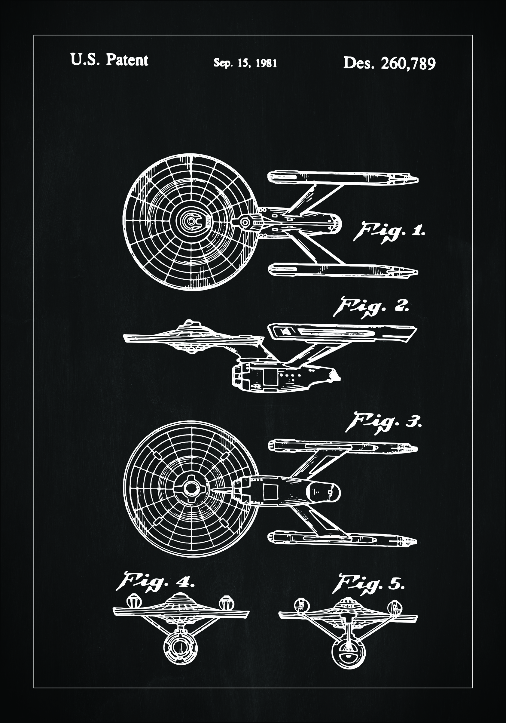 Šis patentinis plakatas pristato ikonišką kosminio laivo Enterprise iš "Star Trek" dizaino koncepciją, datuotą 1981 m. rugsėjo 15 d. su patentu Nr. Des. 260,789. Tai stilizuota vizualizacija, primenanti mokslinės fantastikos nuotykius ir tarpžvaigždines keliones. Detalūs piešiniai vaizduoja laivo formą iš įvairių kampų ir perspektyvų, pabrėžiant tiek jo simetriją, tiek sudėtingas struktūras. Šis patentinis brėžinys jungia mokslinį nuostabą ir estetinį malonumą, ir yra puikus pokalbių kūrėjas, suteikiantis naujoviško ir optimistiško požiūrio bet kokiai aplinkai.