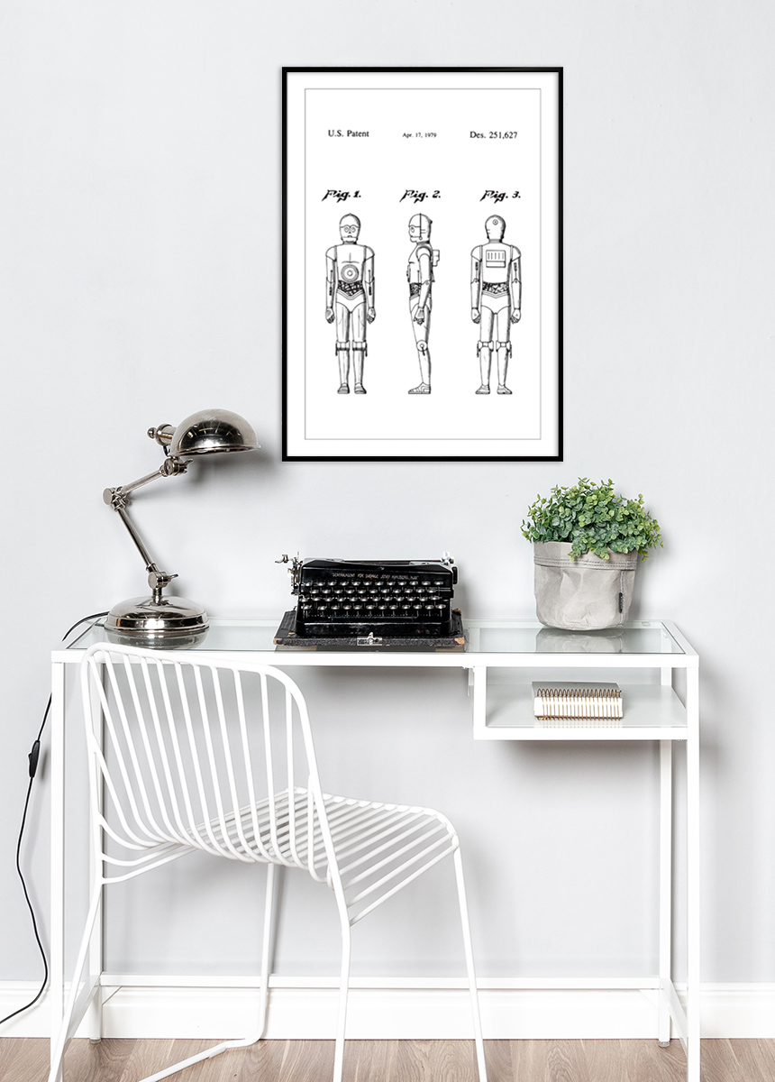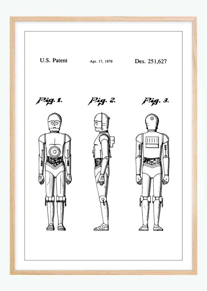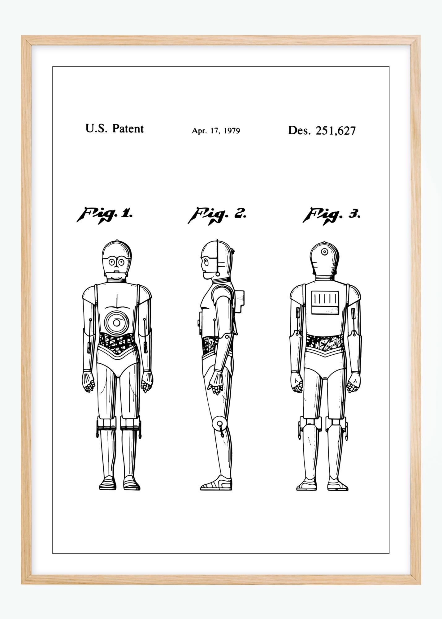 Šis unikalus patentinis plakatas vaizduoja C3PO iš StarWars, su JAV patentu Des. 251,627, suteiktu 1979 m. balandžio 17 d. Figūra yra pavaizduota iš trijų skirtingų kampų, kas suteikia visapusišką dizaino apžvalgą. Šis plakatas užfiksuoja ankstyvą susižavėjimą robotų technologijomis ir jų potencialiomis taikymo sritimis. Su savo detaliu ir techniškai sukurtu vaizdu, tai yra puiki sienų dekoracija technologijų entuziastams ir retrofuturizmo gerbėjams.