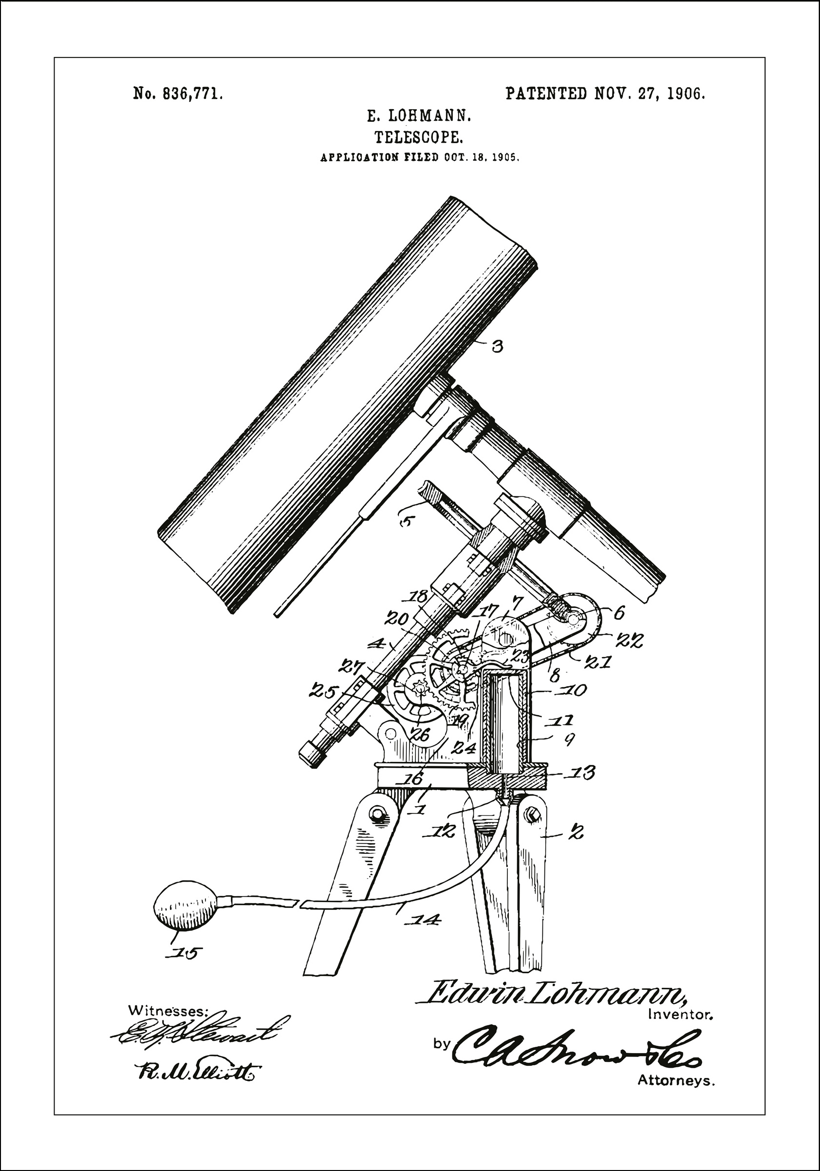 Ši patentų diagrama iliustruoja meistrišką teleskopo dizainą, E. Lohmanno išradimą, patentuotą 1906 m. lapkričio 27 d. numeriu 836,771. Brėžinio detalumas išryškina techninius komponentus ir mechaninį šio optinio instrumento sudėtingumą. Juoda ir balta iliustracija, atsižvelgiant į juodą foną, suteikia stiprų vizualinį kontrastą, kuris padidina techninį Lohmanno dizaino eleganciją ir paverčia jį geidžiama interjero detale visiems, besidomintiems mokslu ir astronomija.