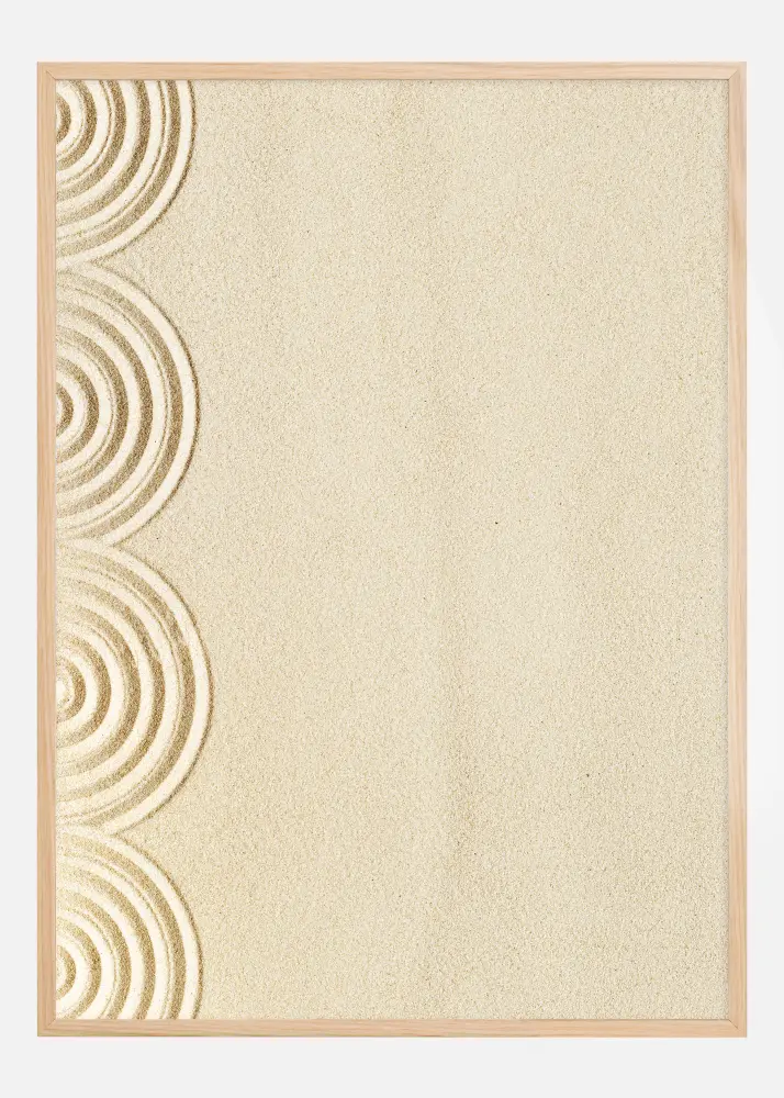 Šis stilingas ir atpalaiduojantis plakatas vaizduoja meniškus raštus, sukurtus smėlyje, kurie sukuria zen ir ramybės jausmą. Švelni smėlio spalvos fonas suteikia beveik meditacinį tuštumos pojūtį, o raštai kairėje patraukia dėmesį savo organinėmis, šluojančiomis linijomis ir koncentriškų apskritimų formomis. Šis minimalistinis meno kūrinys yra pagarbos atiduoklė paprastam gamtos grožiui ir subtiliems meno kūriniams, kuriuos galima sukurti tik keliais teptuko judesiais ar pirštais.
