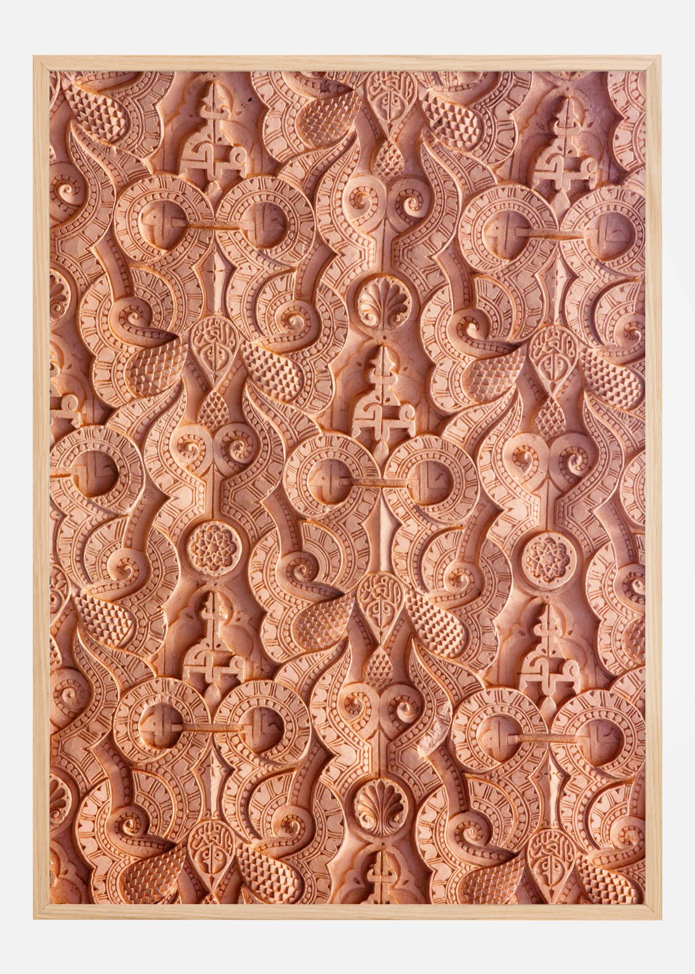 Šis žavus plakatas yra detalumo ir meistriškumo demonstravimas. Motyvas susideda iš sudėtingo rašto su sudėtingomis išpjovomis, kurios kartu sukuria simetrišką ir hipnotizuojančią dizainą. Plakatas yra tradicinės ornamentikos ir daugelio išraiškos formų, kurias galima pasiekti gerai apgalvotu dizainu, pagerbimas. Tai yra spaudinys, tinkantis interjero entuziastui, kuris nori pridėti kultūrinio turto ir rafinuotumo savo namams ar biurui.