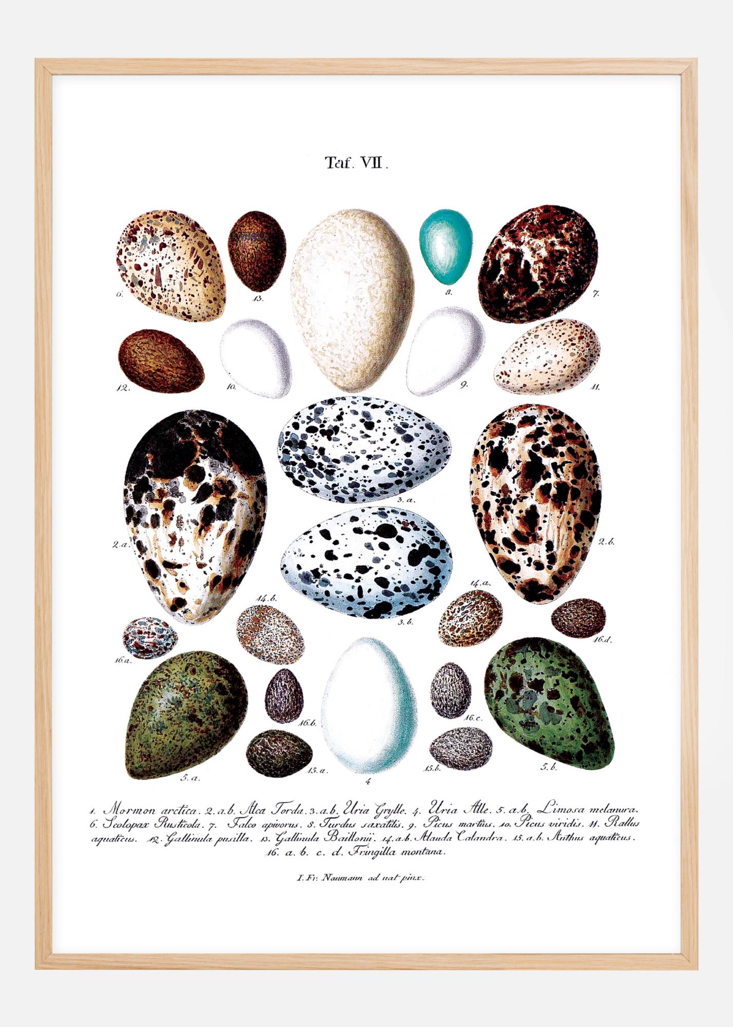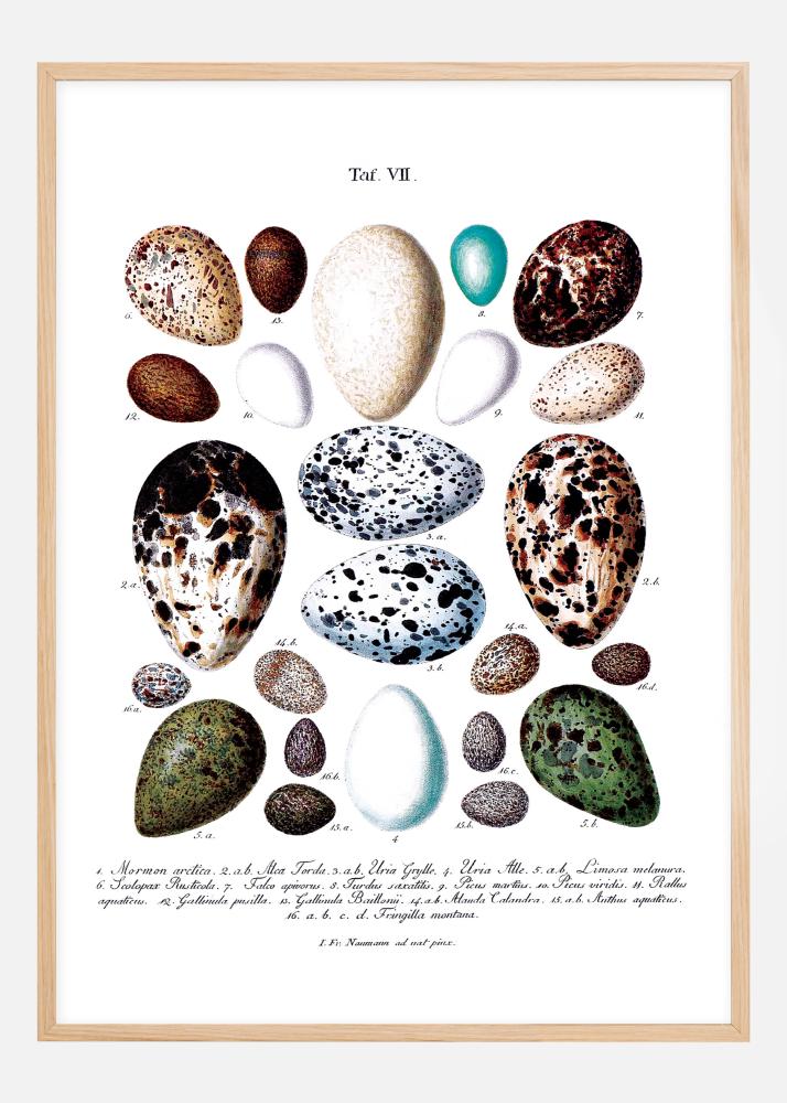 Ar jums patinka spalva ir forma? Tuomet galbūt pagalvojote, kad gamta yra geriausia dizainerė! Šis plakatas yra senos mokyklinės plokštelės, vaizduojančios įvairius paukščių kiaušinius, kopija. Po spalvingais kiaušiniais rasite numerius, kurie nurodo aprašomąjį, lotynišką tekstą apačioje. Tekstas informuoja, kuriai paukščių rūšiai priklauso atitinkamas kiaušinis. Labai gražus plakatas tiems, kurie mėgsta derinti vintažą su natūraliomis spalvomis! Kadangi plakatas yra kelių skirtingų dydžių, lengvai rasite tokį, kuris tiks būtent jums.