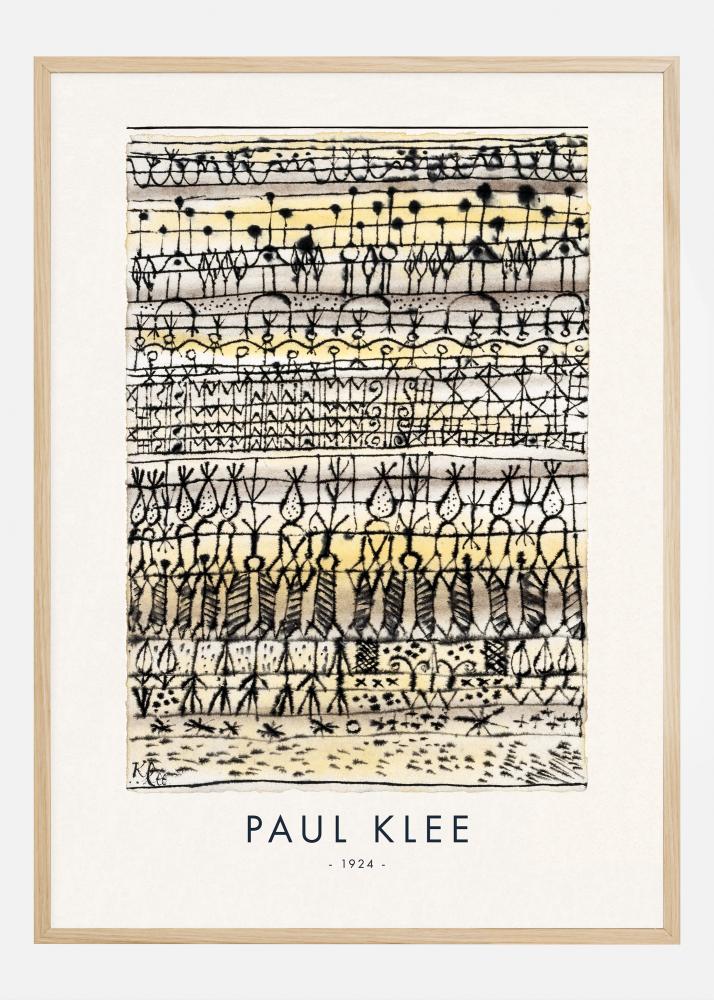 Šiame plakate pavaizduotas Paulo Klee kūrinys "Aušinimas karštos zonos sode" iš 1924 metų, sudėtingas linijų ir formų raštas, primenantis sodą abstrakčiame kraštovaizdyje. Žaismingai Klee tyrinėja gamtos ir struktūros temas, dėliodamas simbolinių ir geometrinių elementų sluoksnius vieną ant kito, kurdamas ritmišką ir beveik muzikinę kompoziciją. Įvairiapusiškas linijų tipų naudojimas ir kontrastingų spalvų derinimas suteikia gyvybę abstrakčiam sodui būdingai Klee menui.