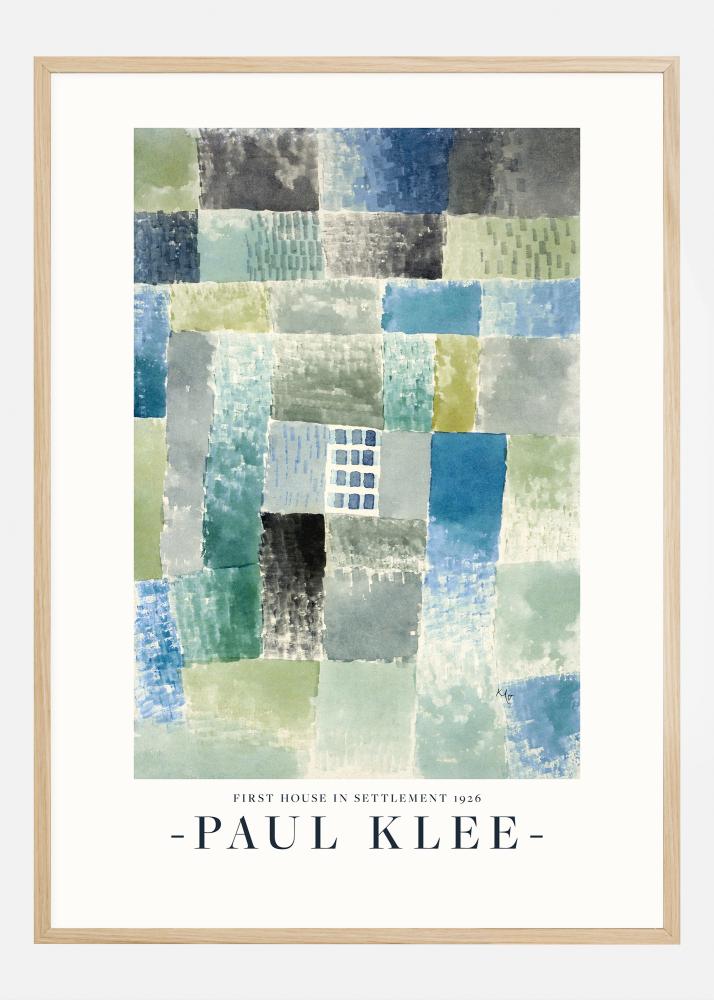 Šis gyvybingas Paul Klees 1926 metų kūrinys "Pirmasis namas gyvenvietėje" yra spalvų ir formų mozaika, kuri susipina į žavingą miesto panoramą. Įvairiapusiai kvadratai ir stačiakampiai sukuria abstrakčią kaimo vietovę su šaltomis ir šiltomis mėlynos, žalios ir pilkos atspalvių tonacijomis, sukeldami ramybės kupino mažo miestelio pojūtį. Klee žaidžia su perspektyva, kai kurios blokos atrodo esančios pirmame plane, o kitos fone, leidžiančios akiai klajoti po kūrinio kaitaliojančius peizažus.
