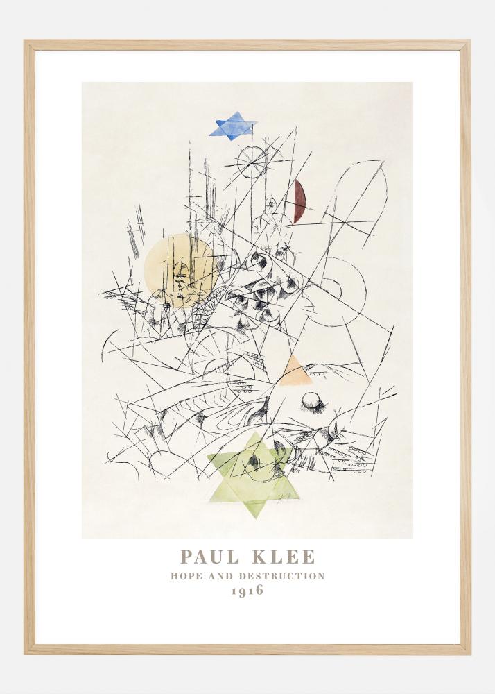 Šis meninis plakatas vaizduoja Paulo Klee kūrinį, pavadintą „Viltis ir naikinimas“ iš 1916 metų, ir užfiksuoja unikalų abstraktaus meno ir simbolikos derinį, būdingą Klee stiliui. Motyvas yra turtingas linijomis ir formomis, kurios sąveikauja per kompozicijos paviršių, suteikiant ir tvarkos, ir chaoso jausmą. Tai spauda, kuri galėtų sudominti tuos, kurie vertina tiek modernų, tiek šiuolaikinį meną, ideali siekiant pridėti apmąstymų dimensiją bet kuriam kambariui ar biurui.