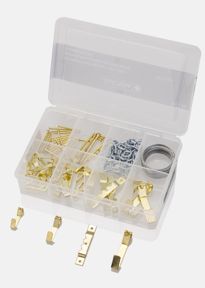 Čia rasite daugumą daiktų, reikalingų kabinti lengvų ir vidutinio svorio plakatus įvairiais būdais! Rinkinį sudaro: