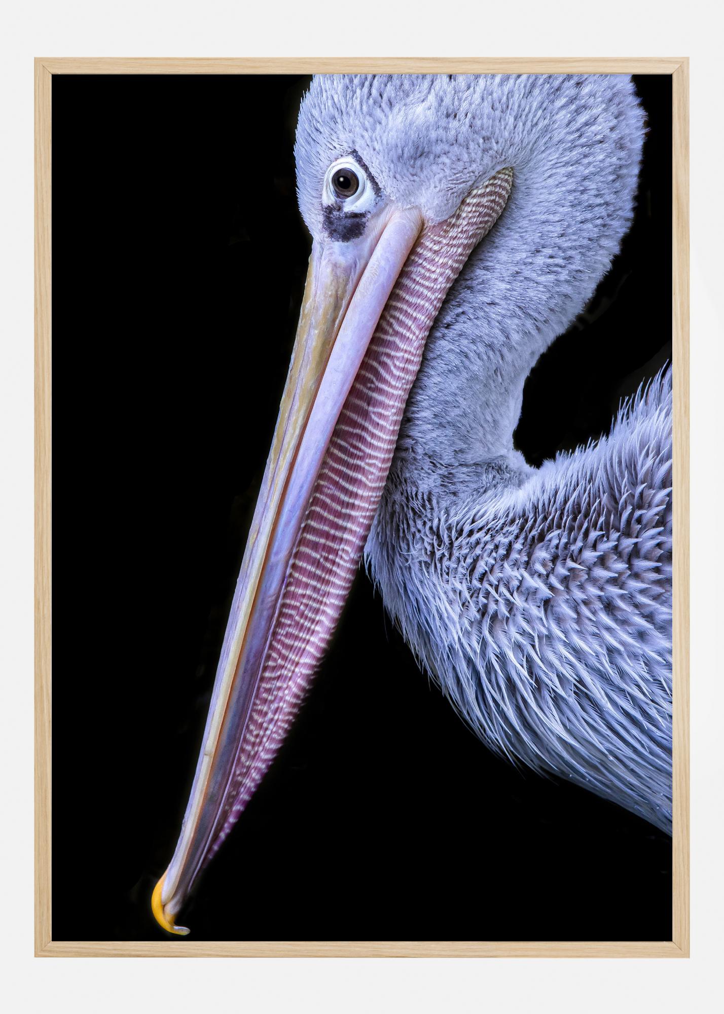 Šis įspūdingas plakatas išryškina pelikanų grožį ir detalumą, su unikalia jo snapu ir plunksnomis, užfiksuotomis prieš gilų juodą foną. Šio įspūdingo paukščio snapas, švelniu rausvu ir geltonu atspalviu, sudaro stiprų kontrastą, suteikdamas motyvui gyvumo ir beveik trimatį gylį. Puikus spaudinys visiems gamtos mylėtojams ir paukščių stebėtojams, norintiems turėti dalį laukinės gamtos savo namuose.