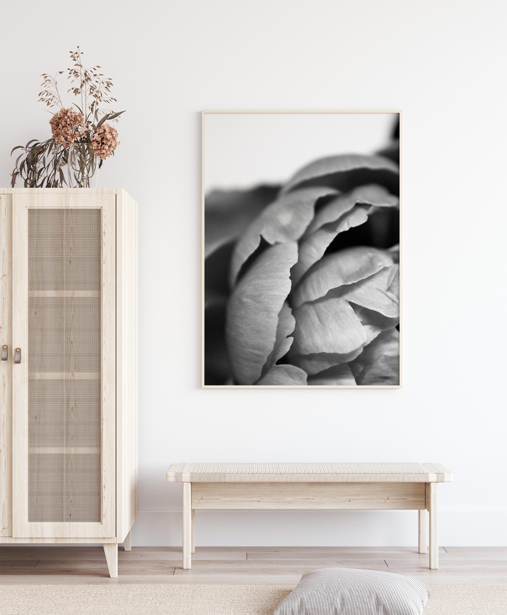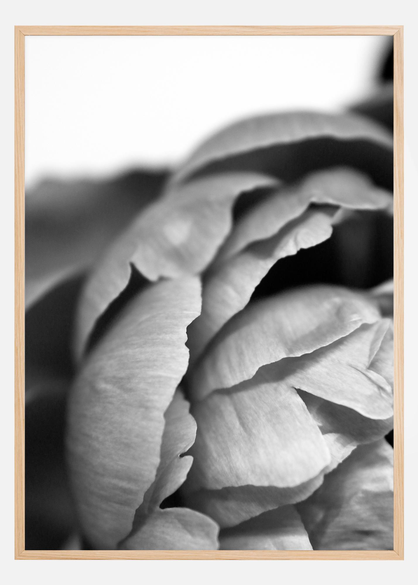 Juodai baltas stambus planas bijūno plakatas. Jo balti žiedlapiai grakščiai bangelėmis dengia vienas kitą ir sudaro kopūsto panašią struktūrą. Neryškiame fone galite grožėtis nepriekaištingai suformuotais šio mielo žiedo lapeliais. Tobulas atspaudas visiems, kurie myli gėles.