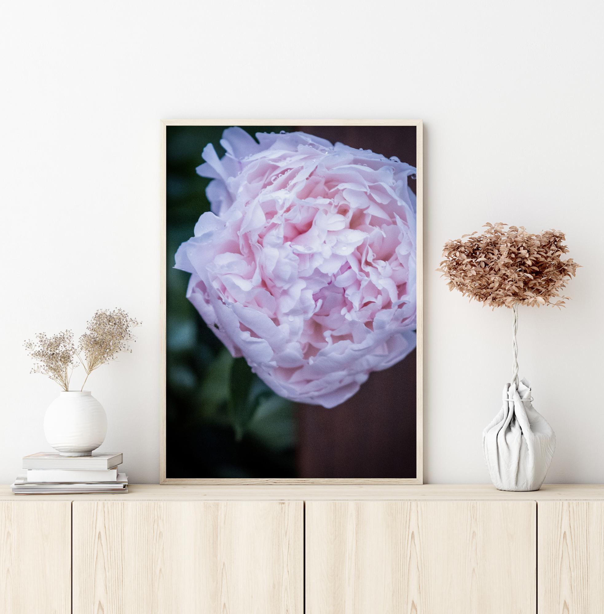 Gražus stambaus plano plakatas su rožiniu bijūnu ir susiglaudusiais žiedlapiais. Kiekvienas žiedlapis sukuria subtilų švelnų vaizdą. Neryškus žalias fonas suteikia šiam žavingam vaizdui papildomo spalvų prisilietimo. Kabinkite šį spaudinį bet kurioje namų patalpoje, kad praskaidrintumėte savo dieną.