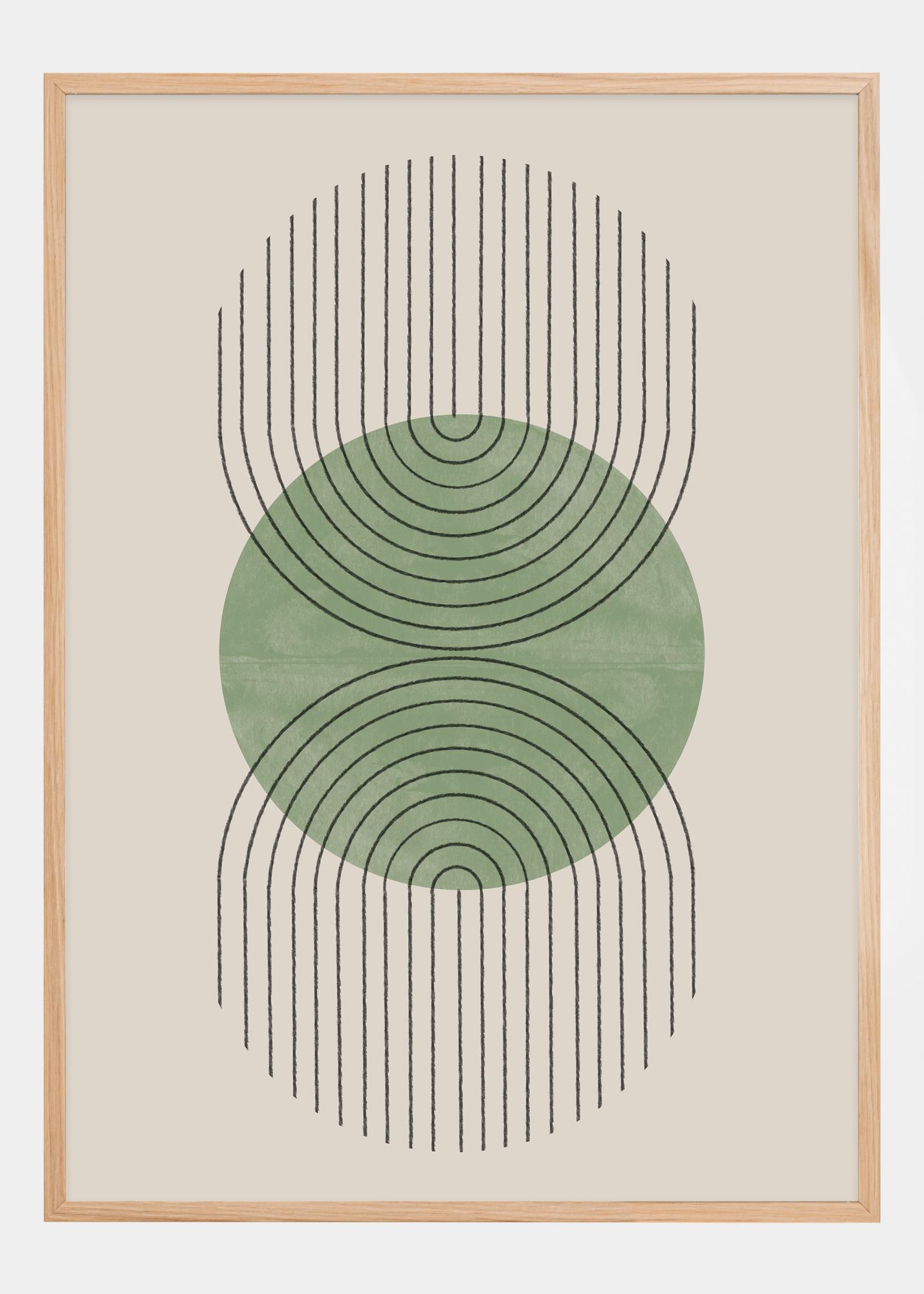Šis plakatas yra minimalistinis meno kūrinys, kuriame pabrėžiama sodri žalia apskritiminė forma, apsupta juodų linijų serijos, suteikianti erdvės ir gylio pojūtį. Žalias apskritimo atspalvis skiriasi intensyvumu, sukurdama vizualinį dimensijos ir tekstūros efektą. Linijos, besitęsiančios iš apskritimo krašto, sukelia beveik hipnotizuojantį efektą ir simbolizuoja geometrinę harmoniją.