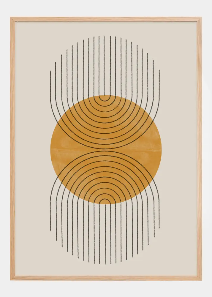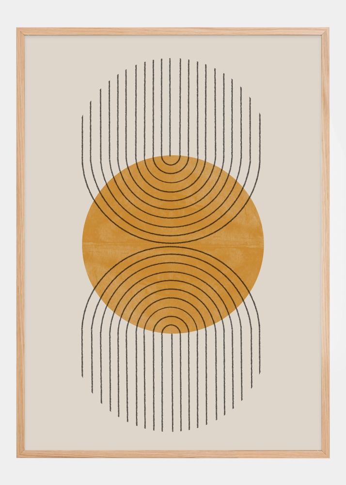 Šis meniškas plakatas pristato stiprią vizualinę kompoziciją, kuri pasiekta centrine, sodria, auksine geltona apskritimo forma, apsupta vertikalių juodų linijų, kurios kuria optinę plėtimosi ir susitraukimo iliuziją. Koncentriniai apskritimai geltonos formos viduje prideda gylio jausmą ir suteikia organišką kokybę kitaip griežto geometrinio rašto.