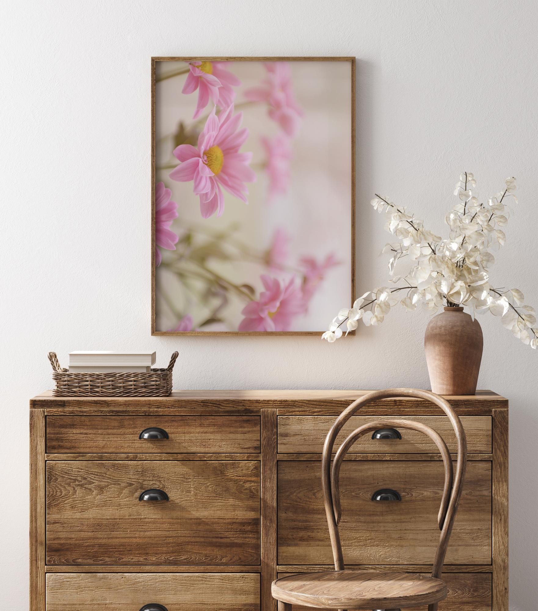 Stambus planšetinis plakatas su gražiomis rausvomis ramunių gėlėmis. Ant smėlinio fono gėlių grožis sukuria linksmą ir ramią atmosferą. Su šviesiai geltonu žiedadulkiu, tai yra tobulas spaudinys, norint sukurti ramią ir mylinčią nuotaiką.