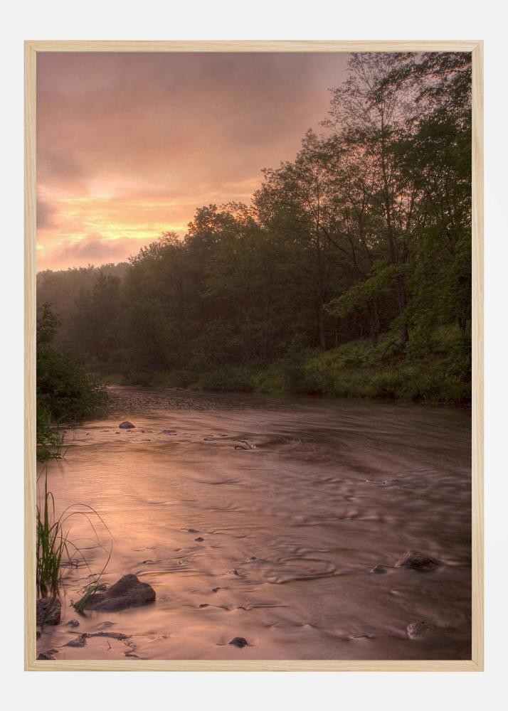 Nuostabus purvinos upės, tekančios per mišką, atspaudas. Oranžinė vakaro saulė leidžiasi per debesis, suteikdama subtilų oranžinį toną paveikslui. Pakabinkite šį magišką plakatą svetainėje ir sekite srovę.