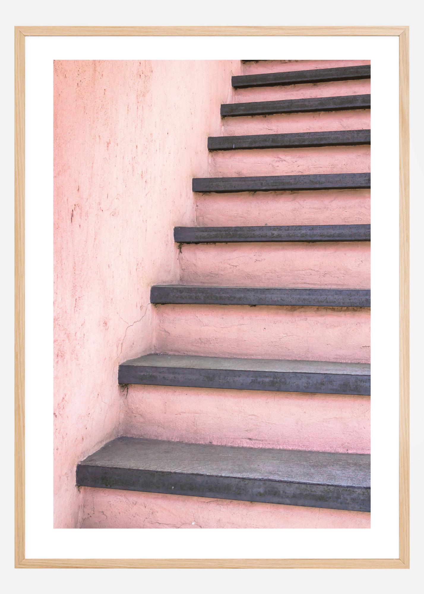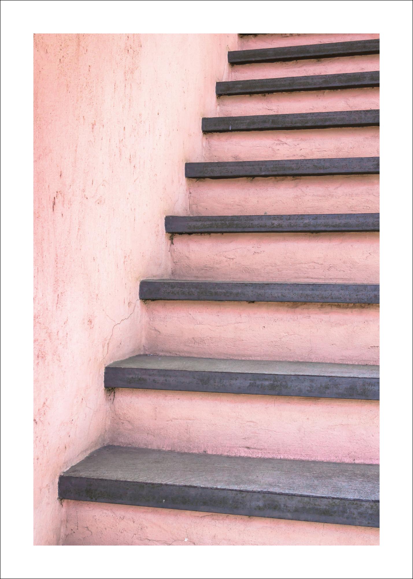 Fotografija su laiptų, kuriuose dera puikūs rožinės pastelinės ir pilkos betono kontrastai. Paprastas ir elegantiškas plakatas, puikiai tinkantis derinti su kitais mėgstamais paveikslais didesnėje paveikslų sienoje. Tinka daugumai namų ir interjero stilių.