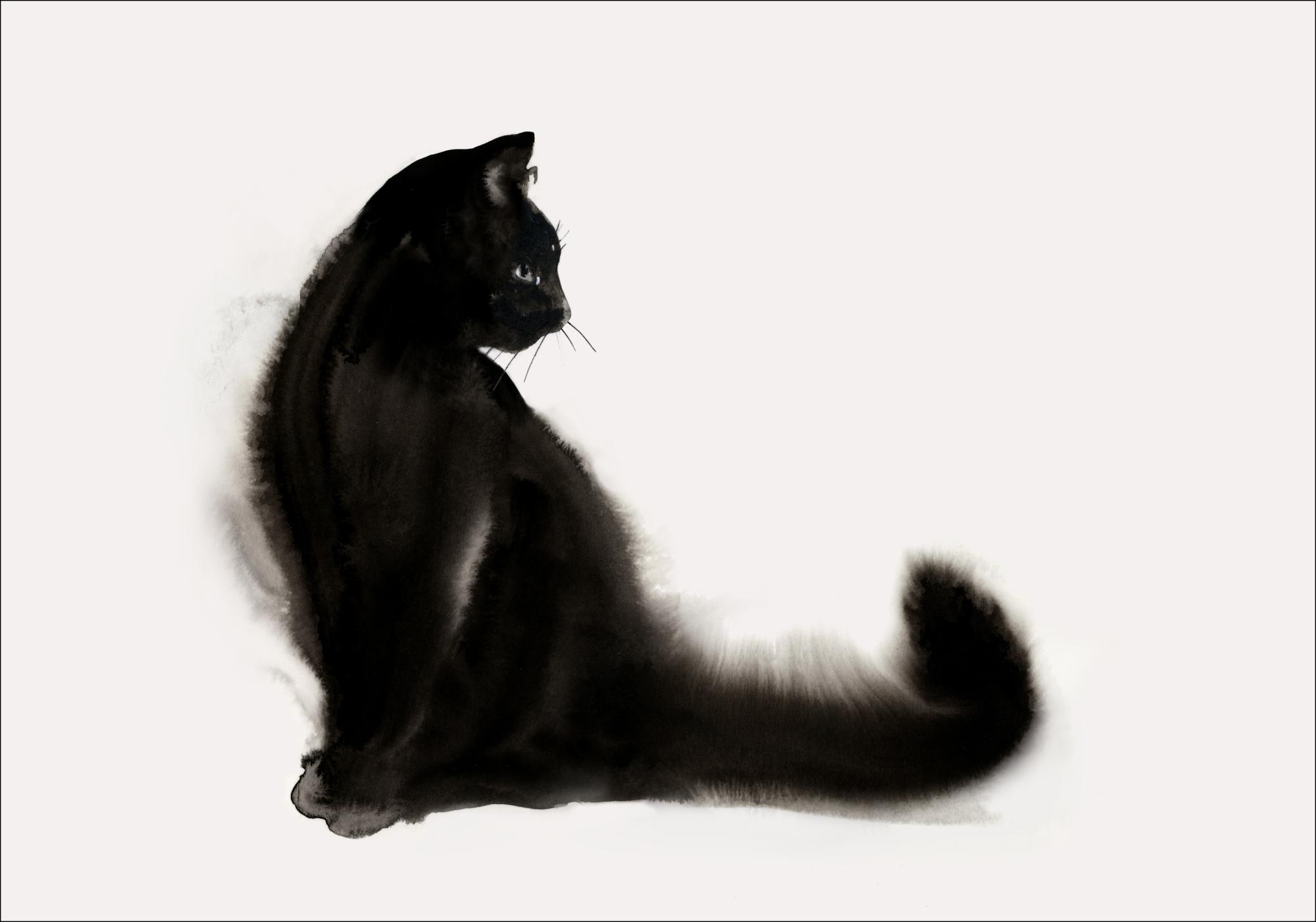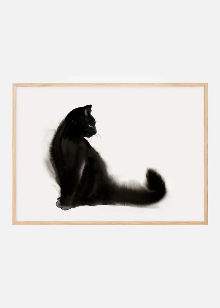 Gražus juodo birmietiško katino atvaizdas. Juodasis katinas baltoje aplinkoje žiūri per petį tarsi kažką stebėdamas. Natūrali šviesa apšviečia katino priekines kojas ir sukuria baltą dėmę. Puikus plakatas katinų mylėtojams.