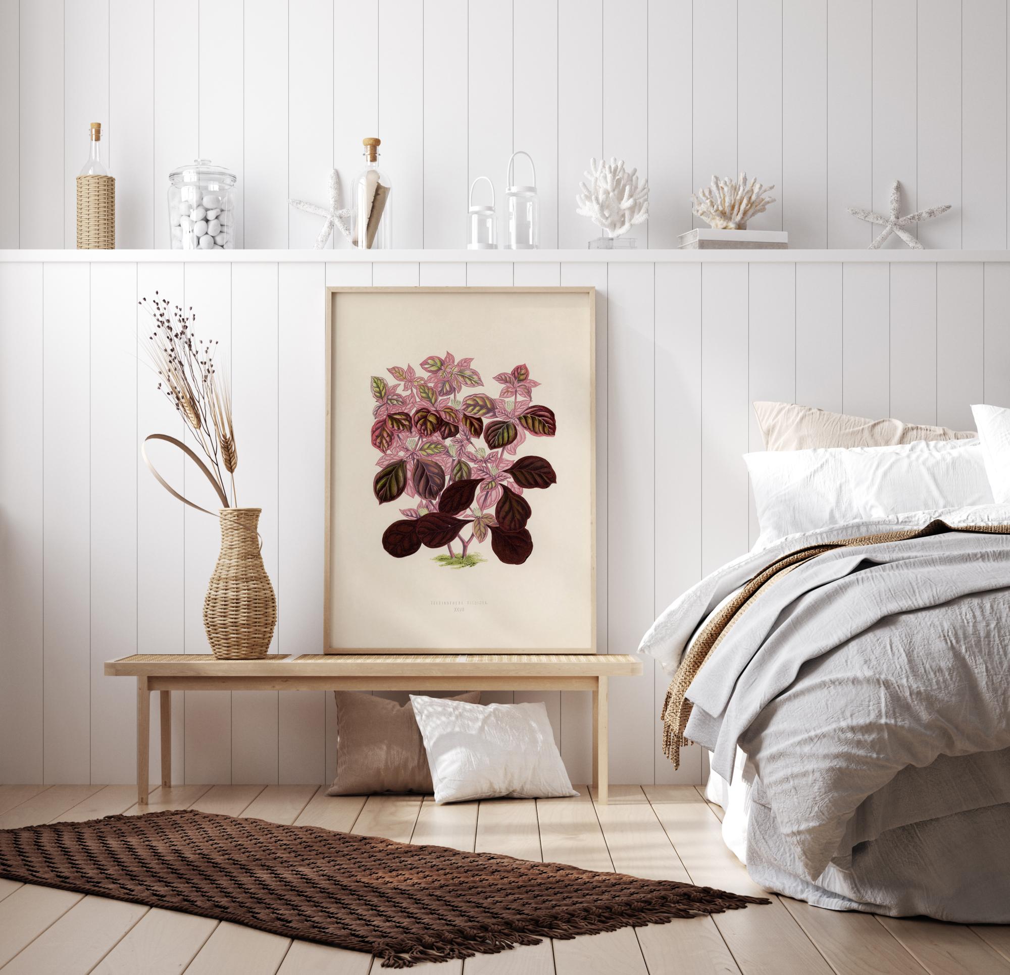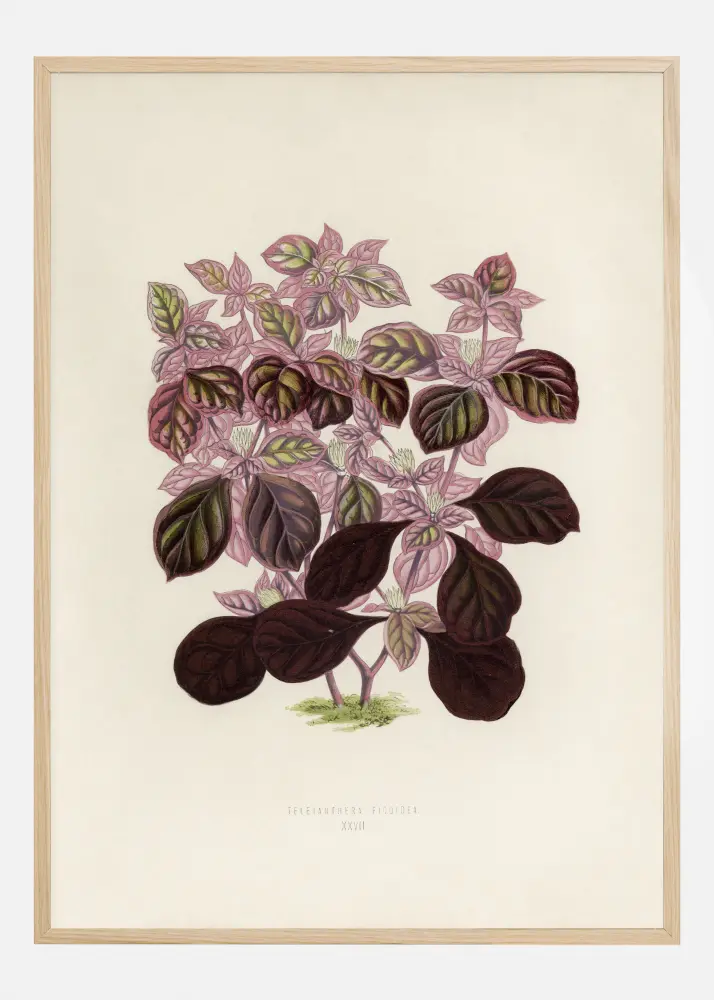 Gražus rankomis atspaustas dviejų rožinių Plectranthus scutellarioides atvaizdas. Švelnus smėlio spalvos fonas pabrėžia gražius rožinės ir žalios spalvų atspalvius. Augalo stiebo link, vyno raudona spalva sukuria šiltą jausmą plakate. Pakabinkite šį spaudinį savo meno kolekcijoje namuose.