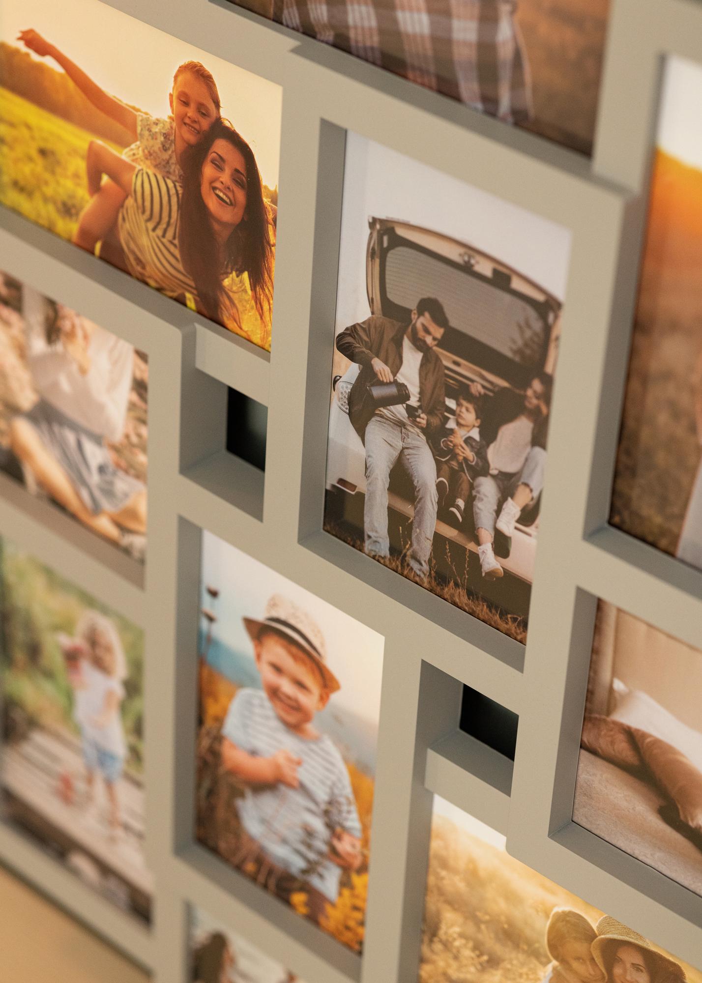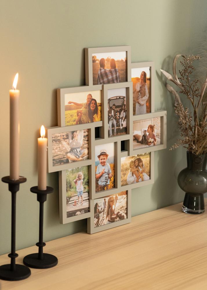 Tai yra koliažo rėmas su vieta 10 nuotraukų 10x15 cm. Rėmas maišo nuotraukas vertikaliu ir horizontaliu formatu, sukuriant labai dinamišką išraišką. Sofistikuota pilka spalva pakels jūsų nuotraukų spalvų atspalvius ir leis motyvams atsidurti dėmesio centre. Įstatote savo motyvus į rėmą nuėmę galinę dalį, kuri laikoma mažais sukamaisiais spaustukais. Visos nuotraukos yra laikomos vienu galiniu dangteliu, todėl galite paprastai išdėstyti visas nuotraukas rėme vienu metu.
