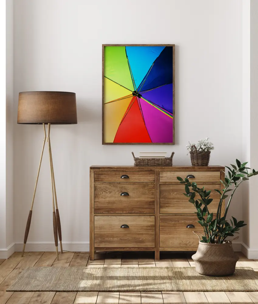 Daugiagrafinis skėčio atspaudas. Stipri šviesa šviečia ant nuostabių spalvų. Raudona, oranžinė, geltona, žalia, gili mėlyna, tamsiai mėlyna, violetinė ir rožinė. Šis ryškus ir linksmintis plakatas būtų puikus pakabinti ant neutralios sienos, kad suteiktų spalvos prisilietimą.