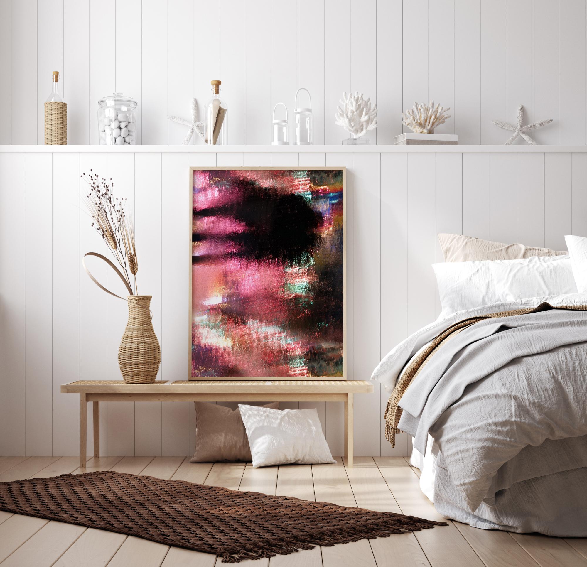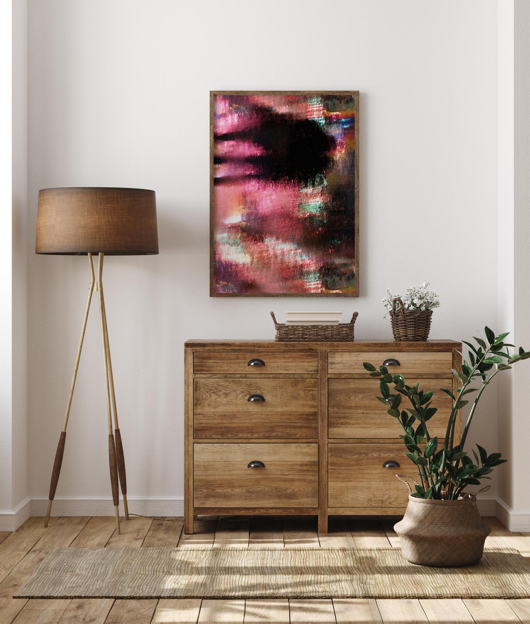 Tobulą spalvų derinį su rožiniais atspalviais dominuoja šis daugiaspalvis spaudinys. Spaudinio viršuje yra juoda sritis, kuri sukuria gylio pojūtį. Dešinėje juodos srities pusėje yra vertikali vamzdžio forma raudonos ir žalios spalvos. Puikus plakatas, skirtas pridėti spalvų prisilietimą prie neutralios sienos.