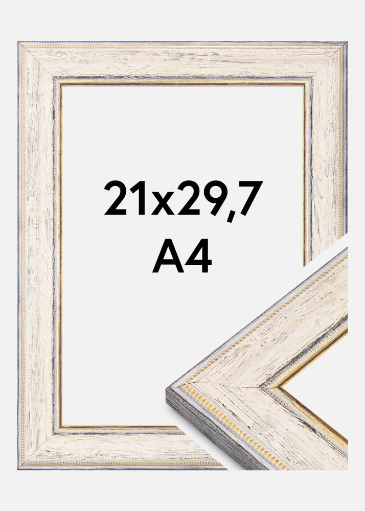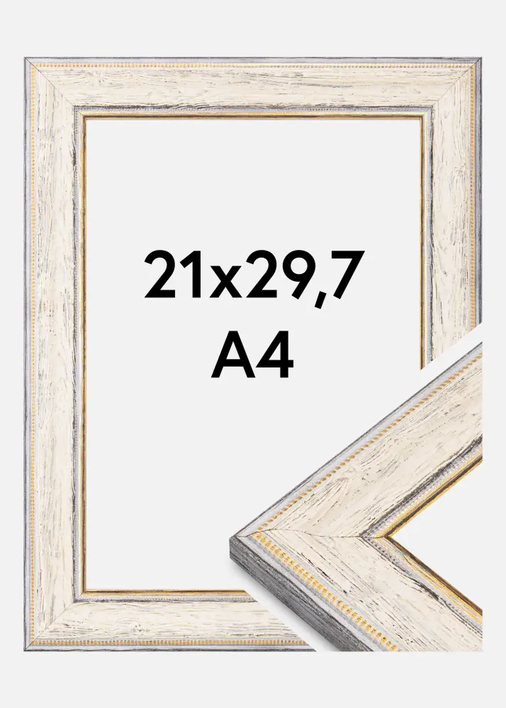 Šis gražus nuotraukų rėmelis, kurio dydis yra 21x29,7 cm (A4), yra puikus derinys tarp vintažo įkvėpto dizaino ir modernios funkcionalumo. Su savo kaimiško balto ir pilko medžio apdaila, papildyta subtiliomis auksinėmis detalėmis palei vidinį kraštą, šis rėmelis siūlo žavingai senovinę išvaizdą. Profilinis dizainas ir aiški medžio struktūra daro jį puikiu pasirinkimu kaimiškoms, „shabby chic“ ar klasikiniams interjero stiliams.