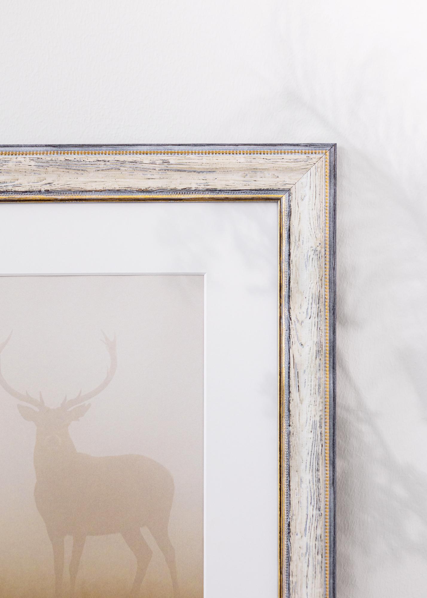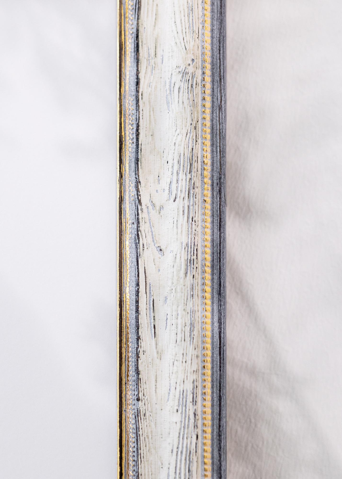 Ši graži nuotraukų rėmelis, kurio dydis yra 30x40 cm, yra tobula vintage įkvėpimo ir šiuolaikinės elegancijos derinys. Pagaminta iš medžio, rėmas turi rustišką baltą ir pilką apdailą, kuri suteikia žavingai pasenusią išvaizdą. Subtilios auksinės detalės palei vidinį kraštą suteikia klasikinį prisilietimą, dėl kurio rėmas puikiai dera tiek kaimo, tiek shabby chic interjere.