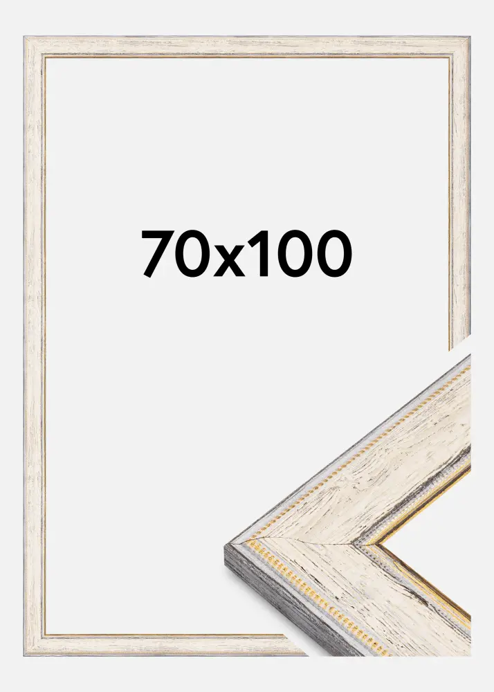 Šis gražus nuotraukų rėmelis yra tobula derinys tarp vintage įkvėpimo ir šiuolaikinio elegancijos. Su savo rustic balta ir pilka medžio apdaila, papildyta subtiliomis aukso detalėmis palei vidinį kraštą, jis siūlo žaviai senovišką išvaizdą. Rėmas yra sukurtas taip, kad tilptų dydžio 70x100 cm motyvus, todėl jis yra idealus norint pabrėžti tavo mėgstamas nuotraukas ar meno kūrinius su nesenstančiu ir rafinuotu jausmu.