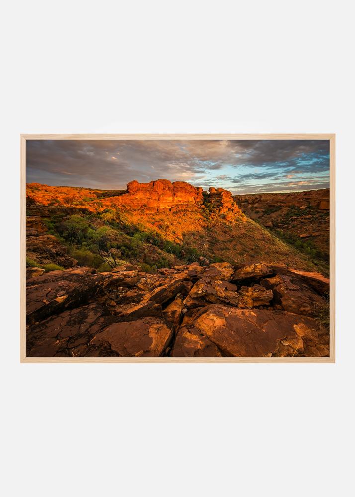 Plakatas su raudonų dykumos kalnų fotografija saulėlydyje skirta tiems, kurie mėgsta dykumas ir uolienų formacijas, kad pakabintų ant sienos. Šilti raudoni tonai priešais ledinį mėlyną dangų ir gilumas nuotraukoje sukuria įdomų motyvą. Įrėminkite plakatą dailiu rėmeliu ir įdėkite jį į paveikslų sieną kartu su kitais dykumos motyvais.