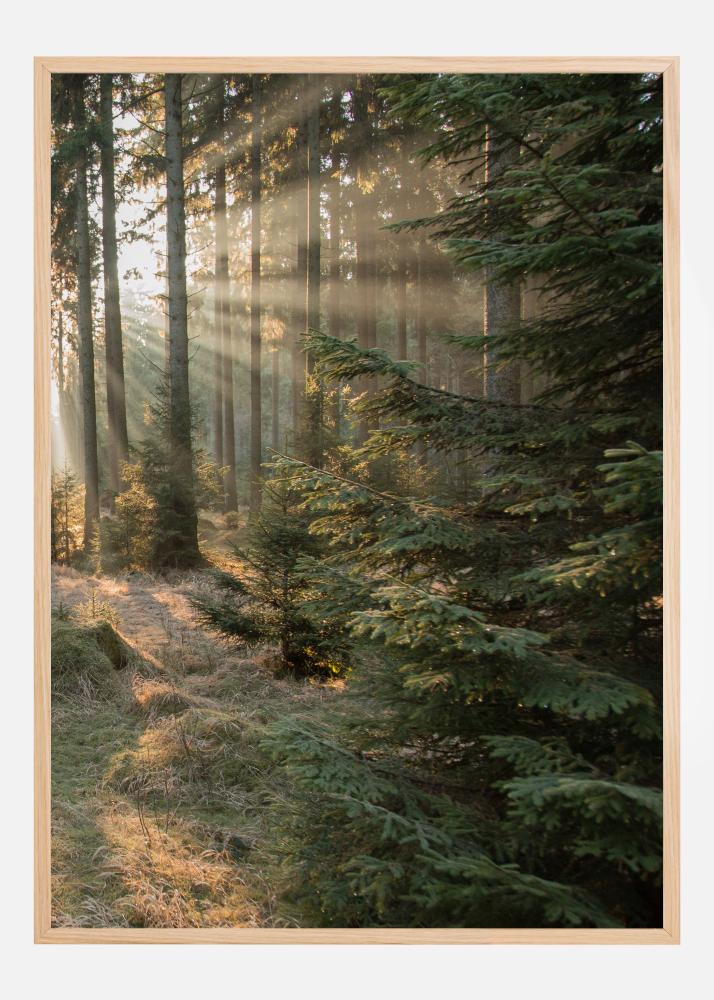 Žavingas miško portretas. Kai saulėlydis šviečia per lapus, žemę supa mažesni medžiai. Šis vaizdingas kraštovaizdis sukuria maloniai šiltą atmosferą ir raminančią bei gaivinančią aplinką. Puikus plakatas žaliam svetainės kambariui.